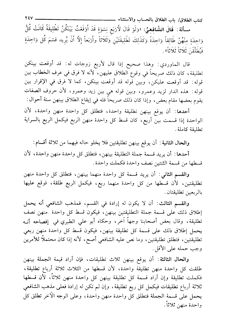 قَالَ الْمَاوَرْدِيُّ: وَهَذَا صَحِيحٌ إِذَا قَالَ لِأَرْبَعِ زَوْجَاتٍ لَهُ: قَدْ أَوْقَعْتُ بَيْنَكُنَّ تَطْلِيقَةً، كَانَ ذَلِكَ صَرِيحًا فِي وُقُوعِ الطَّلَاقِ عَلَيْهِنَّ، لِأَنَّهُ لَا فَرْقَ فِي عُرْفِ الْخِطَابِ بَيْنَ قَوْلِهِ: قَدْ أَوْقَعْتُ عَلَيْكُنَّ، وَبَيْنَ قَوْلِهِ قَدْ أَوْقَعْتُ بَيْنَكُنَّ، كَمَا لَا فَرْقَ فِي الْإِقْرَارِ بَيْنَ قَوْلِهِ: هَذِهِ الدَّارُ لِزَيْدٍ وَعَمْرٍو، وَبَيْنَ قَوْلِهِ هِيَ بَيْنَ زَيْدٍ وَعَمْرٍو، لِأَنَّ حُرُوفَ الصِّفَاتِ يَقُومُ بَعْضُهَا مَقَامَ بَعْضٍ، وَإِذَا كَانَ ذَلِكَ صَرِيحًا فَلَهُ فِي إِيقَاعِ الطَّلَاقِ بَيْنَهُنَّ سِتَّةٌ أَحْوَالٍ: