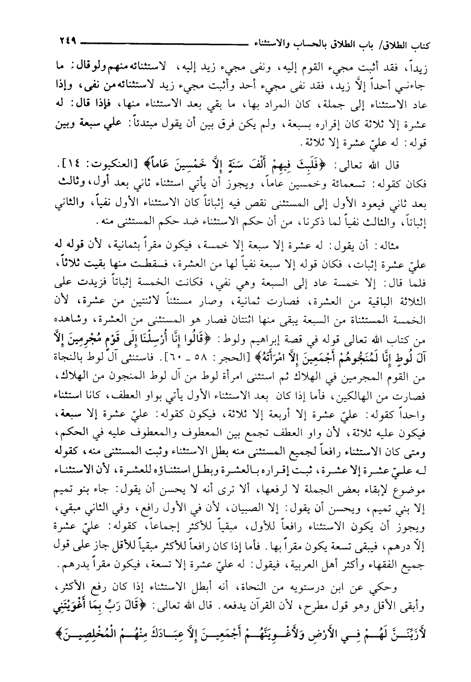 قَالَ اللَّهُ تَعَالَى: {فَلَبِثَ فِيهِمْ أَلْفَ سَنَةٍ إِلا خَمْسِينَ عَامًا} [العنكبوت: 14] . فَكَانَ كَقَوْلِهِ: تِسْعَمِائَةٍ وَخَمْسِينَ عَامًا، وَيَجُوزُ أَنْ يَأْتِيَ اسْتِثْنَاءٌ ثَانِي بَعْدَ أَوَّلٍ وَثَالِثٌ بَعْدَ ثَانِي فَيَعُودُ الْأَوَّلُ إِلَى الْمُسْتَثْنَى نَقَصَ فِيهِ إِثْبَاتًا كَانَ الِاسْتِثْنَاءُ الْأَوَّلُ نَفْيًا، وَالثَّانِي إِثْبَاتًا، وَالثَّالِثُ نَفْيًا لِمَا ذَكَرْنَا، مِنْ أَنَّ حُكْمَ الِاسْتِثْنَاءِ ضِدُّ حُكْمِ الْمُسْتَثْنَى مِنْهُ.