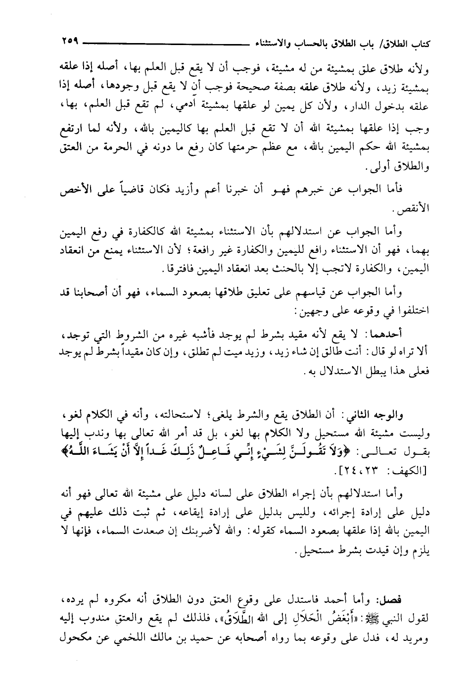وَأَمَّا اسْتِدْلَالُهُمْ بِأَنَّ إِجْرَاءَ الطَّلَاقِ عَلَى لِسَانِهِ دَلِيلٌ عَلَى مَشِيئَةِ اللَّهِ تَعَالَى فَهُوَ أَنَّهُ دَلِيلٌ عَلَى إرادة إجرائه، ولليس بِدَلِيلٍ عَلَى إِرَادَةِ إِيقَاعِهِ، ثُمَّ ثَبَتَ ذَلِكَ عَلَيْهِمْ فِي الْيَمِينِ بِاللَّهِ إِذَا عَلَّقَهَا بِصُعُودِ السَّمَاءِ كَقَوْلِهِ: وَاللَّهِ لَأَضْرِبَنَّكِ إِنْ صَعِدْتِ السَّمَاءَ، فإنها لا يلزم وَإِنْ قُيِّدَتْ بِشَرْطٍ مُسْتَحِيلٍ.
