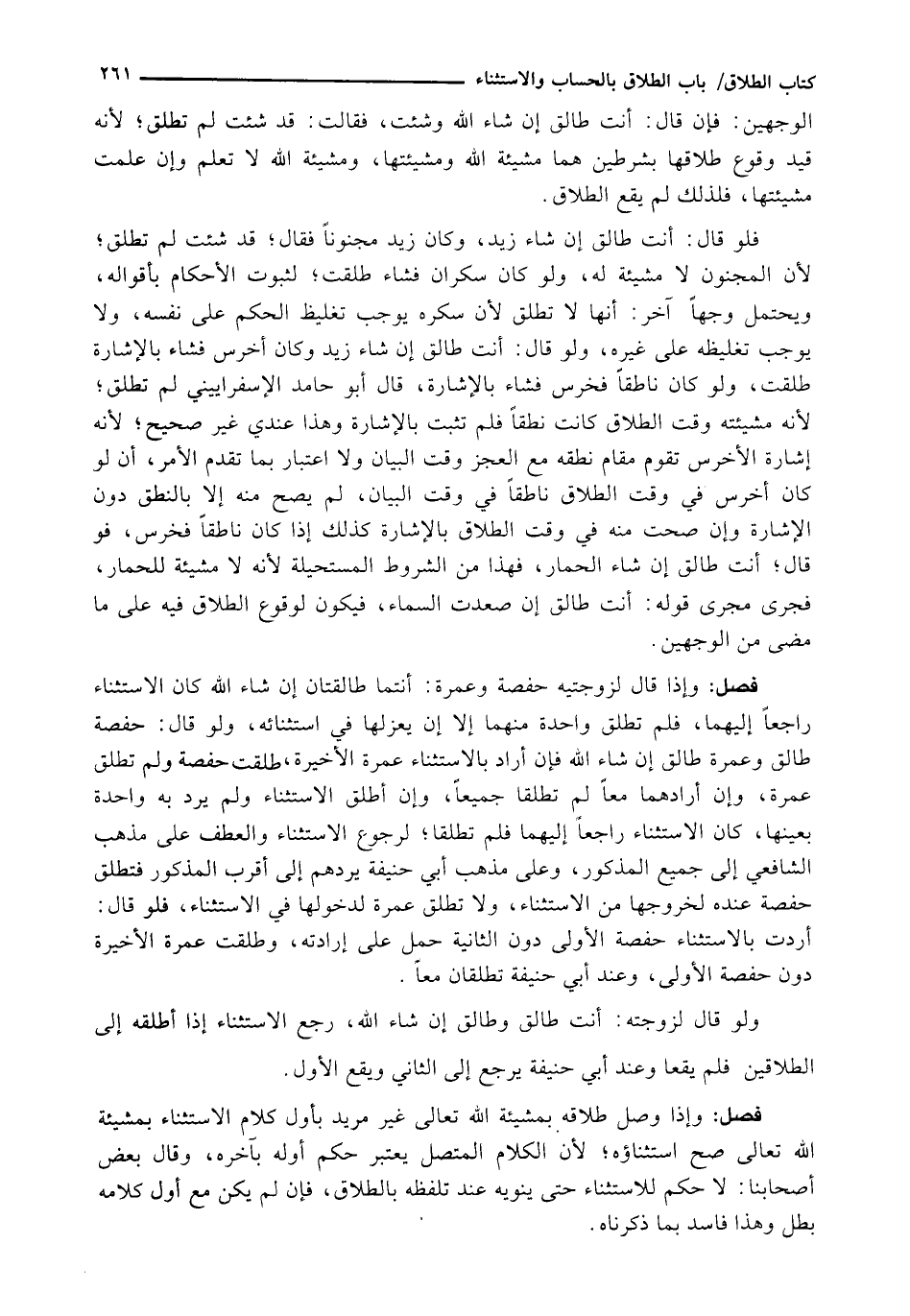 وَلَوْ قَالَ لِزَوْجَتِهِ: أَنْتِ طَالِقٌ وَطَالِقٌ إِنْ شَاءَ اللَّهُ، رَجَعَ الِاسْتِثْنَاءُ إِذَا أَطْلَقَهُ إِلَى الطَّلَاقَيْنِ فَلَمْ يَقَعَا وَعِنْدَ أَبِي حَنِيفَةَ يَرْجِعُ إِلَى الثَّانِي وَيَقَعُ الْأَوَّلُ.