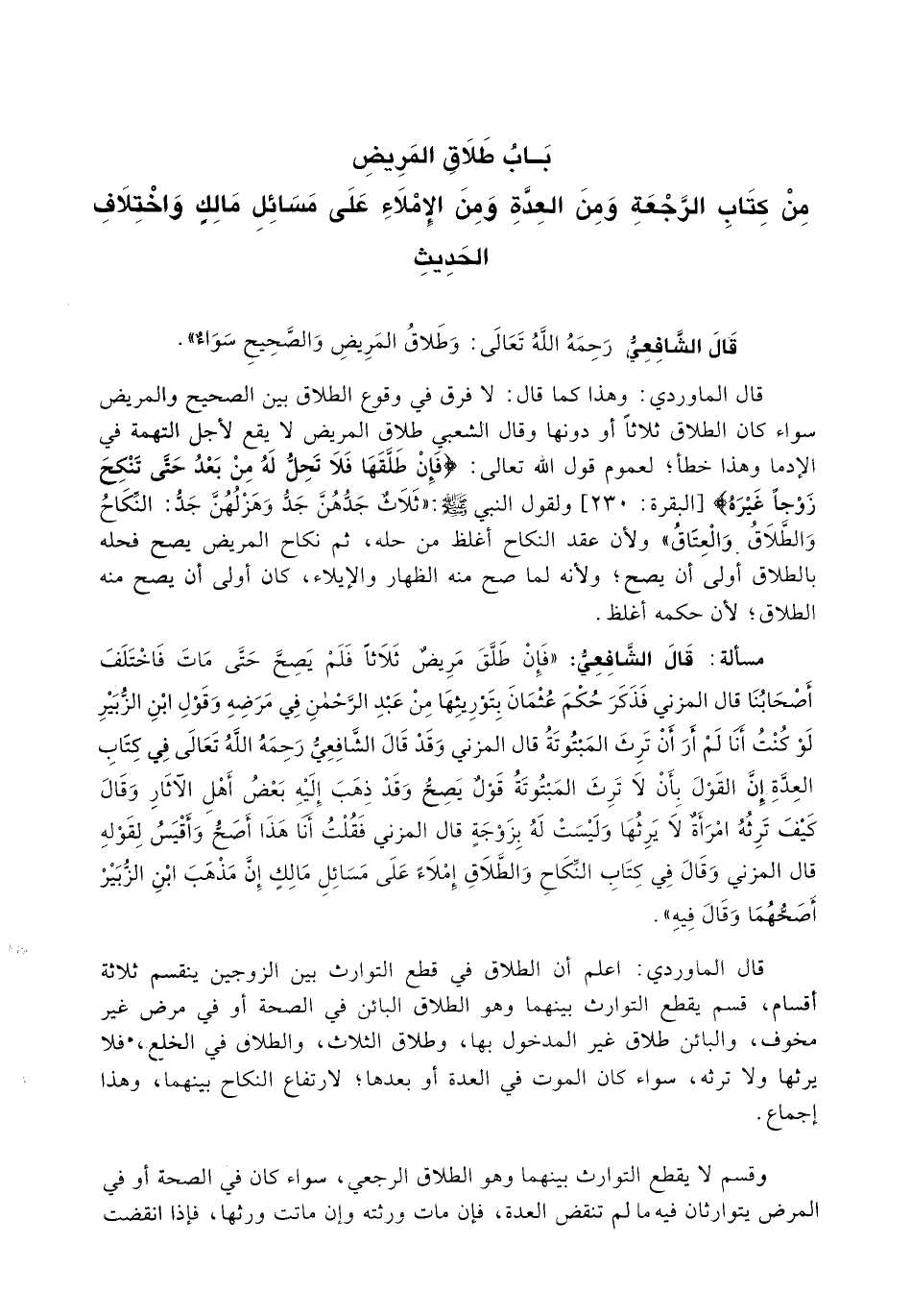 قال الشافعي: (فَإِنْ طَلَقَ مَرِيضٌ ثَلَاثًا فَلَمْ يَصِحَّ حَتَى مَاتَ فَاخْتَلَفَ أَصْحَابُنَا قَالَ الْمُزَنِيُّ فَذَكَرَ حُكْمَ عُثْمَانَ بِتَوْرِيثِهَا مِنْ عَبْدِ الرَّحْمَنِ فِي مَرَضِهِ وَقَوْلَ ابْنِ الزُّبَيْرِ لَوْ كُنْتُ أَنَا لَمْ أَرَ أَنْ تَرِثَ الْمَبْتُوتَةُ قَالَ الْمُزَنِيُّ وَقَدْ قَالَ الشَّافِعِيُّ رَحِمَهُ اللَّهُ تعالى فِي كِتَابِ الْعِدَّةِ إِنَّ الْقَوْلَ بِأَنْ لَا تَرِثَ المَبْتُوتَةُ قَوْلٌ يَصِحُّ وَقَدْ ذِهَبَ إِلَيْهِ بَعْضُ أَهْلِ الْآثَارِ وَقَالَ كَيْفَ تَرِثُهُ امْرَأَةٌ لا يرثها وليست له بزوجة قال المزني فقلت أنا هذا أصح وأقيس لقوله قال المزني وَقَالَ فِي كِتَابِ النِّكَاحِ وَالطَّلَاقِ إِمْلَاءً عَلَى مسائل مالك إن مذهب ابن الزبير أصحهما وقال فيه) .