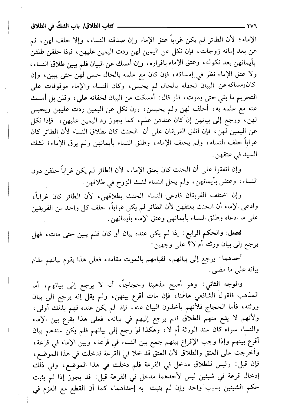 وَالْوَجْهُ الثاني: وهو أصح مذهبنا وحجاجاً، أَنَّهُ لَا يُرْجَعُ إِلَى بَيَانِهِمْ، أَمَّا الْمَذْهَبُ فَلِقَوْلِ الشَّافِعِيِّ هَاهُنَا، فَإِنْ مَاتَ أُقْرِعَ بَيْنَهُنَّ، وَلَمْ يَقُلْ إِنَّهُ يُرْجَعُ إِلَى بَيَانِ وَرَثَتِهِ، فَأَمَّا الْحِجَاجُ فَلِأَنَّهُمْ يَأْخُذُونَ الْبَيَانَ عَنْهُ، فَإِذَا لَمْ يَكُنْ عِنْدَهُ فَهُمْ بِذَلِكَ أَوْلَى، وَلِأَنَّهُمْ لَا يَقَعُ مِنْهُمُ الطَّلَاقُ فَلَمْ يُرْجَعْ إِلَيْهِمْ فِي بَيَانِهِ، فَعَلَى هَذَا يُقْرَعُ بَيْنَ الْإِمَاءِ وَالنِّسَاءِ سَوَاءٌ كَانَ عِنْدَ الْوَرَثَةِ أَمْ لَا، وَهَكَذَا لَوْ رُجِعَ إِلَى بَيَانِهِمْ فَلَمْ يَكُنْ عِنْدَهُمْ بَيَانٌ أُقْرِعَ بَيْنَهُمْ وَإِذَا وَجَبَ الْإِقْرَاعُ بَيْنَهُمْ جُمِعَ بَيْنَ النِّسَاءِ فِي قُرْعَةٍ، وَبَيْنَ الْإِمَاءِ فِي قُرْعَةٍ، وَأُخْرِجَتْ عَلَى الْعِتْقِ وَالطَّلَاقِ لأن العتق قد خلا فِي الْقُرْعَةِ فَدَخَلَتْ فِي هَذَا الْمَوْضِعِ، فَإِنْ قِيلَ: وَلَيْسَ لِلطَّلَاقِ مَدْخَلٌ فِي الْقُرْعَةِ فَلِمَ دَخَلَتْ فِي هَذَا الْمَوْضِعِ، وَفِي ذَلِكَ إِدْخَالُ قُرْعَةٍ فِي شَيْئَيْنِ لَيْسَ لِأَحَدِهِمَا مَدْخَلٌ فِي الْقُرْعَةِ قِيلَ: قَدْ يَجُوزُ إِذَا لَمْ يَثْبُتْ حُكْمُ الشَّيْئَيْنِ بِسَبَبٍ وَاحِدٍ وَإِنْ لَمْ يَثْبُتْ بِهِ إِحْدَاهُمَا، كَمَا أَنَّ الْقَطْعَ مَعَ الْعَزْمِ في