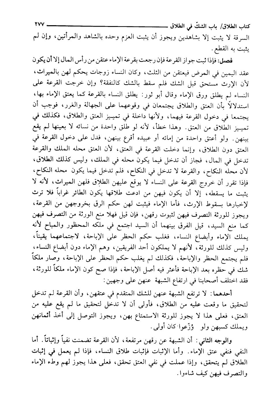 وَالْوَجْهُ الثَّانِي: أَنَّ الشُّبْهَةَ عَنْ رِقِّهِنَّ مُرْتَفِعَةٌ، لِأَنَّ الْقُرْعَةَ تَضَمَّنَتْ نَفْيًا وَإِثْبَاتًا. أَمَّا النَّفْيُ فَنَفْيُ عِتْقِ الْإِمَاءِ. وَأَمَّا الإثبات فإثبات طلاق النساء، فإذا لم يعمل فِي إِثْبَاتِ الطَّلَاقِ لَمْ يَتَحَقَّقْ، وَإِذَا عَمِلَتْ فِي نَفْيِ الْعِتْقِ تَحَقَّقَ، فَعَلَى هَذَا يَجُوزُ لَهُمْ وَطْءُ الْإِمَاءِ وَالتَّصَرُّفُ فِيهِنَّ كَيْفَ شَاءُوا.