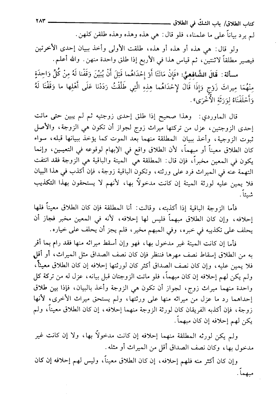 قَالَ الْمَاوَرْدِيُّ: وَهَذَا صَحِيحٌ إِذَا طَلَّقَ إِحْدَى زَوْجَتَيْهِ ثُمَّ لَمْ يُبَيِّنْ حَتَّى مَاتَتْ إِحْدَى الزَّوْجَتَيْنِ، عُزِلَ مَنْ تَرِكَتِهَا مِيرَاثُ زَوْجٍ لِجَوَازِ أَنْ تَكُونَ هِيَ الزَّوْجَةُ، وَالْأَصْلُ ثُبُوتُ الزَّوْجِيَّةِ، وَأُخِذَ بِبَيَانِ الْمُطَلَّقَةِ مِنْهُمَا بَعْدَ الْمَوْتِ كَمَا يُؤْخَذُ بِبَيَانِهَا قَبْلَهُ، سَوَاءٌ كَانَ الطَّلَاقُ مُعَيَّنًا أَوْ مُبْهَمًا، لِأَنَّ الطَّلَاقَ وَاقِعٌ فِي الْإِبْهَامِ لِوُقُوعِهِ فِي التَّعْيِينِ، وَإِنَّمَا يَكُونُ فِي الْمُعَيَّنِ مُخْبِرًا، فَإِنْ قَالَ: الْمُطَلَّقَةُ هِيَ الْمَيِّتَةُ وَالْبَاقِيَةُ هِيَ الزَّوْجَةُ فَقَدِ انْتَفَتِ التُّهْمَةُ عَنْهُ فِي الْمِيرَاثِ فَرُدَّ عَلَى وَرَثَتِهِ، وَتَكُونُ الْبَاقِيَةُ زَوْجَةً، فَإِنْ أُكْذِبَ فِي هَذَا الْبَيَانِ فَلَا يَمِينَ عَلَيْهِ لِوَرَثَةِ الْمَيِّتَةِ إِنْ كَانَتْ مَدْخُولًا بِهَا، لِأَنَّهُمْ لَا يَسْتَحِقُّونَ بِهَذَا التَّكْذِيبِ شَيْئًا.