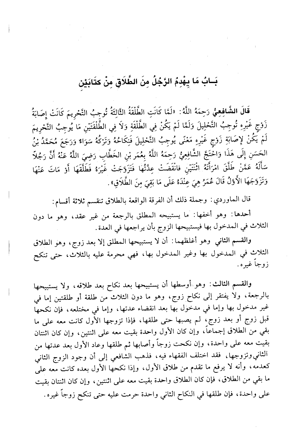وَالْقِسْمُ الثَّالِثُ: وَهُوَ أَوْسَطُهَا أَنْ يَسْتَبِيحَهَا بَعْدَ نِكَاحٍ بَعْدَ طَلَاقِهِ، وَلَا يَسْتَبِيحَهَا بِالرَّجْعَةِ، وَلَا يَفْتَقِرَ إِلَى نِكَاحِ زَوْجٍ، وَهُوَ مَا دُونَ الثَّلَاثِ مِنْ طَلْقَةٍ أَوْ طَلْقَتَيْنِ إِمَّا فِي غَيْرِ مَدْخُولٍ بِهَا وَإِمَّا فِي مَدْخُولٍ بِهَا بَعْدَ انْقِضَاءِ عِدَّتِهَا، وَإِمَّا فِي مُخْتَلِعَهٍ، فَإِنْ نَكَحَهَا قَبْلَ زَوْجٍ أَوْ بَعْدَ زَوْجٍ، لَمْ يُصِبْهَا حَتَّى طَلَّقَهَا، فَإِذَا تَزَوَّجَهَا الْأَوَّلُ كَانَتْ مَعَهُ عَلَى مَا بَقِيَ مِنَ الطَّلَاقِ إِجْمَاعًا، وَإِنْ كَانَ الْأَوَّلُ وَاحِدَةً بَقِيَتْ مَعَهُ عَلَى اثْنَتَيْنِ، وَإِنْ كَانَ اثْنَتَانِ بَقِيَتْ مَعَهُ عَلَى وَاحِدَةٍ، وَإِنْ نَكَحَتْ زَوْجًا وَأَصَابَهَا ثُمَّ طَلَّقَهَا وَعَادَ الْأَوَّلُ بَعْدَ عِدَّتِهَا مِنَ الثَّانِي وَتَزَوَّجَهَا، فَقَدِ اخْتَلَفَ الْفُقَهَاءُ فِيهِ، فَذَهَبَ الشَّافِعِيُّ إِلَى أَنَّ وُجُودَ الزَّوْجِ الثَّانِي كَعَدَمِهِ، وَأَنَّهُ لَا يَرْفَعُ مَا تَقَدَّمَ مِنْ طَلَاقِ الْأَوَّلِ، وَإِذَا نَكَحَهَا الْأَوَّلُ بَعْدَهُ كَانَتْ مَعَهُ عَلَى مَا بَقِيَ مِنَ الطَّلَاقِ، فَإِنْ كَانَ الطَّلَاقُ وَاحِدَةً بَقِيَتْ مَعَهُ عَلَى اثْنَتَيْنِ، وَإِنْ كَانَ اثْنَتَانِ بَقِيَتْ عَلَى وَاحِدَةٍ، فَإِنْ طَلَّقَهَا فِي النِّكَاحِ الثَّانِي وَاحِدَةً حُرِّمَتْ عَلَيْهِ حَتَّى تَنْكِحَ زَوْجًا غَيْرَهُ.