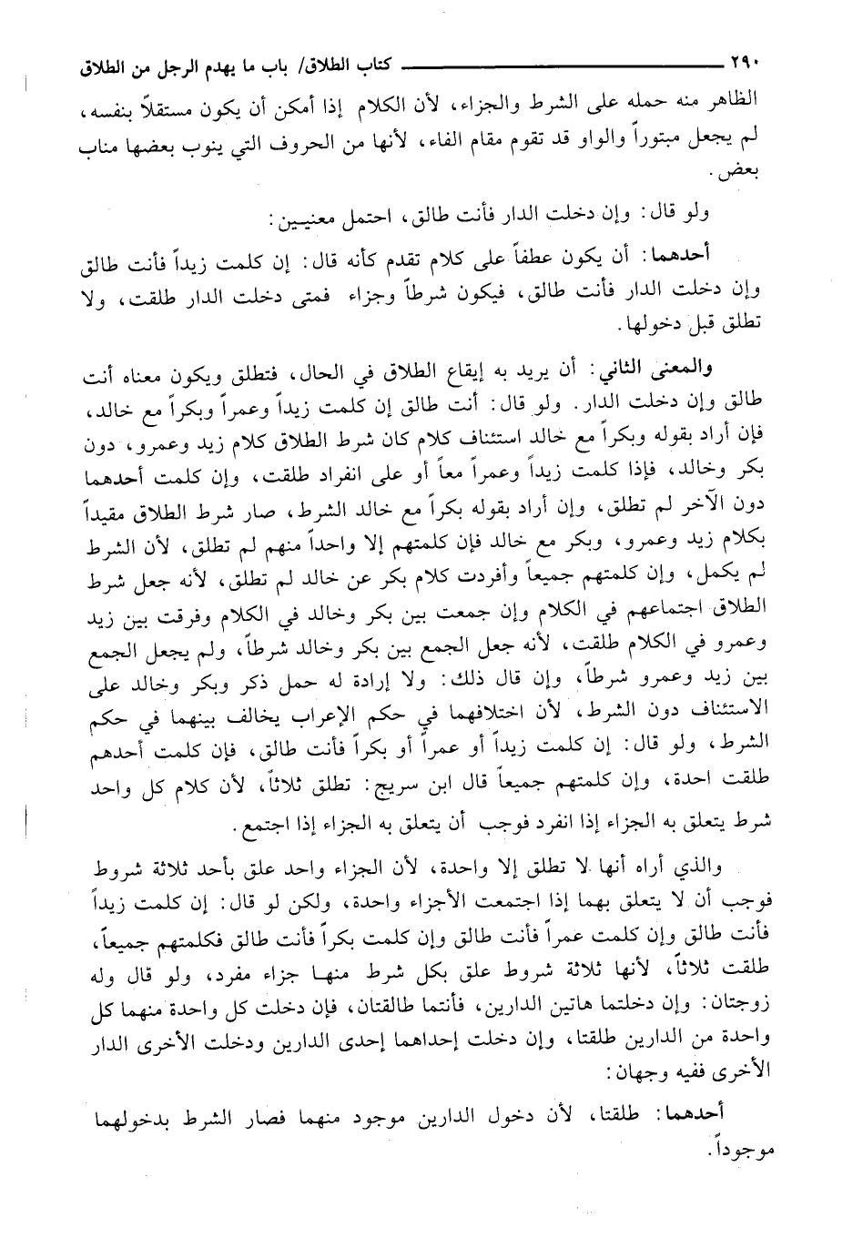 وَالْمَعْنَى الثَّانِي: أَنْ يُرِيدَ بِهِ إِيقَاعَ الطَّلَاقِ فِي الْحَالِ، فَتُطَلَّقُ وَيَكُونُ مَعْنَاهُ أَنْتِ طَالِقٌ وَإِنْ دَخَلْتِ الدَّارَ. وَلَوْ قَالَ: أَنْتِ طَالِقٌ إِنْ كَلَّمْتِ زَيْدًا وَعَمْرًا وَبَكْرًا مَعَ خَالِدٍ، فَإِنْ أَرَادَ بِقَوْلِهِ وَبَكْرًا مَعَ خَالِدٍ اسْتِئْنَافَ كَلَامٍ كَانَ شَرْطُ الطَّلَاقِ كَلَامَ زَيْدٍ وَعَمْرٍو، دُونَ بَكْرٍ وَخَالِدٍ، فَإِذَا كَلَّمَتْ زَيْدًا وَعَمْرًا مَعًا أَوْ عَلَى انْفِرَادٍ طُلِّقَتْ، وَإِنْ كَلَّمَتْ أَحَدَهُمَا دُونَ الْآخَرِ لَمْ تُطَلَّقْ، وَإِنْ أَرَادَ بِقَوْلِهِ بَكْرًا مَعَ خَالِدٍ الشَّرْطَ، صَارَ شَرْطُ الطَّلَاقِ مُقَيَّدًا بِكَلَامِ زَيْدٍ وَعَمْرٍو، وَبَكْرٍ مَعَ خَالِدٍ فَإِنْ كَلَّمَتْهُمْ إِلَّا وَاحِدًا مِنْهُمْ لَمْ تُطَلَّقْ، لِأَنَّ الشَّرْطَ لَمْ يَكْمُلْ، وَإِنْ كَلَّمَتْهُمْ جَمِيعًا وَأَفْرَدَتْ كَلَامَ بَكْرٍ عَنْ خَالِدٍ لَمْ تُطَلَّقْ، لِأَنَّهُ جَعَلَ شَرْطَ الطَّلَاقِ اجْتِمَاعَهُمْ فِي الْكَلَامِ وَإِنْ جَمَعَتْ بَيْنَ بَكْرٍ وَخَالِدٍ فِي الْكَلَامِ وَفَرَّقَتْ بَيْنَ زَيْدٍ وَعَمْرٍو فِي الْكَلَامِ طُلِّقَتْ، لِأَنَّهُ جَعَلَ الْجَمْعَ بَيْنَ بَكْرٍ وَخَالِدٍ شَرْطًا، وَلَمْ يَجْعَلِ الْجَمْعَ بَيْنَ زَيْدٍ وَعَمْرٍو شَرْطًا، وَإِنْ قَالَ ذَلِكَ: وَلَا إِرَادَةَ له حمل ذكر وبكر وَخَالِدٍ عَلَى الِاسْتِئْنَافِ دُونَ الشَّرْطِ، لِأَنَّ اخْتِلَافَهُمَا فِي حُكْمِ الْإِعْرَابِ يُخَالِفُ بَيْنَهُمَا فِي حُكْمِ الشَّرْطِ، وَلَوْ قَالَ: إِنْ كَلَّمْتِ زَيْدًا أَوْ عَمْرًا أَوْ بَكْرًا فَأَنْتِ طَالِقٌ، فَإِنْ كَلَّمَتْ أَحَدَهُمْ طُلِّقَتْ وَاحِدَةً، وَإِنْ كَلَّمَتْهُمْ جَمِيعًا قَالَ ابْنُ سُرَيْجٍ: تُطَلَّقُ ثَلَاثًا، لِأَنَّ كَلَامَ كُلِّ وَاحِدٍ شَرْطٌ يَتَعَلَّقُ بِهِ الْجَزَاءُ إِذَا انْفَرَدَ فَوَجَبَ أَنْ يَتَعَلَّقَ بِهِ الْجَزَاءُ إِذَا اجْتَمَعَ.