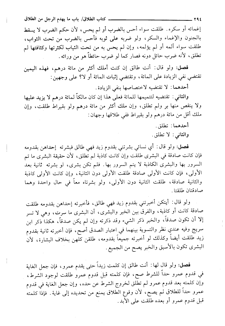 إِغْمَائِهِ أَوْ سُكْرِهِ، طُلِّقَتْ سَوَاءٌ أَحَسَّ بِالضَّرْبِ أم لَمْ يُحِسَّ، لِأَنَّ حُكْمَ الضَّرْبِ لَا يَسْقُطُ بِالْجُنُونِ وَالْإِغْمَاءِ وَالسُّكْرِ، وَلَوْ ضَرَبَهُ عَلَى ثَوْبِهِ فأحس بالضرب من تحت الثواب، طُلِّقَتْ سَوَاءٌ آلَمَهُ أَوْ لَمْ يُؤْلِمْهُ، وَإِنْ لَمْ يُحِسَّ بِهِ مِنْ تَحْتِ الثِّيَابِ لِكَثْرَتِهَا وَكَثَافَتِهَا لَمْ تُطَلَّقْ، لِأَنَّهُ ضَرْبُ حَائِلٍ دُونَهُ فَصَارَ كَمَا لَوْ ضَرَبَ حَائِطًا هُوَ مِنْ وَرَائِهِ.