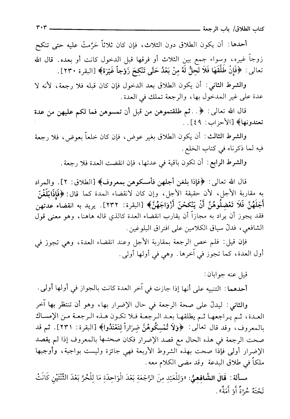 وَالثَّانِي: لِيَدُلَّ عَلَى صِحَّةِ الرَّجْعَةِ فِي حَالِ الْإِضْرَارِ بِهَا، وَهُوَ أَنْ تَنْتَظِرَ بِهَا آخِرَ الْعِدَّةِ، ثُمَّ يُرَاجِعَهَا ثُمَّ يُطَلِّقَهَا بَعْدَ الرَّجْعَةِ فَلَا تَكُونُ هَذِهِ الرَّجْعَةُ مِنَ الْإِمْسَاكِ بِالْمَعْرُوفِ، وَقَدْ قَالَ تَعَالَى: {وَلا تُمْسِكُوهُنَّ ضِرَارًا لِتَعْتَدُوا} [البقرة: 231] . ثُمَّ قَدْ صَحَّتِ الرَّجْعَةُ فِي هَذِهِ الْحَالِ مَعَ قَصْدِ الإضرار فكان صحتها بِالْمَعْرُوفِ إِذَا لَمْ يَقْصِدِ الْإِضْرَارَ أَوْلَى فَإِذَا صَحَّتِ بِهَذِهِ الشُّرُوطِ الْأَرْبَعَةِ فَهِيَ جَائِزَةٌ وَلَيْسَتْ بِوَاجِبَةٍ، وَأَوْجَبُهَا مِلْكًا فِي طَلَاقِ الْبِدْعَةِ وَقَدْ مضى الكلام معه.