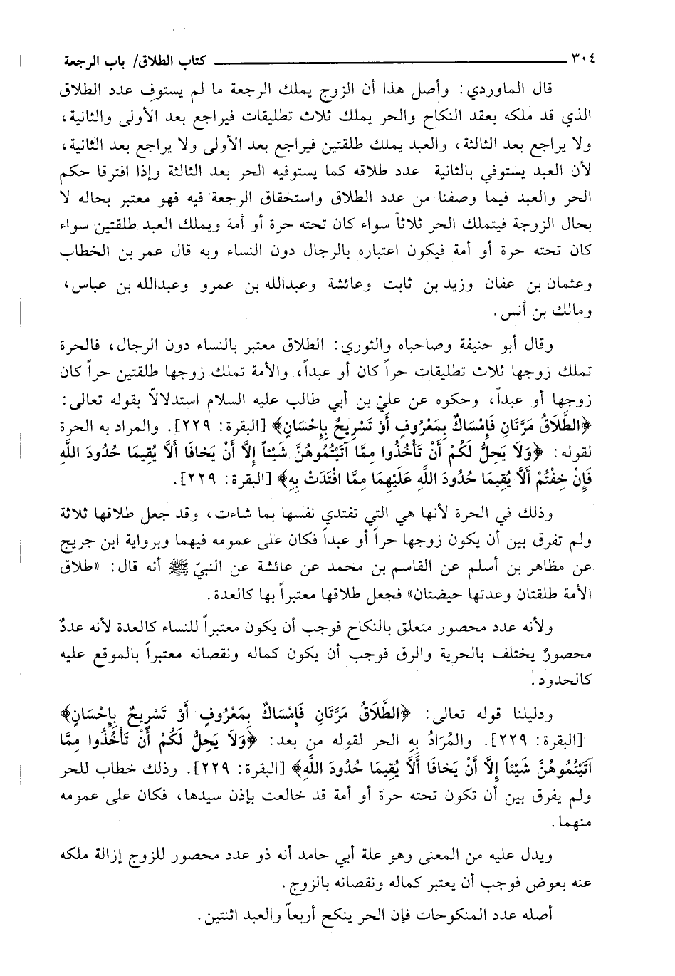 قَالَ الْمَاوَرْدِيُّ: وَأَصْلُ هَذَا أَنَّ الزَّوْجَ يَمْلِكُ الرَّجْعَةَ مَا لَمْ يَسْتَوْفِ عَدَدَ الطَّلَاقِ الَّذِي قَدْ مَلَكَهُ بِعَقْدِ النِّكَاحِ وَالْحُرُّ يَمْلِكُ ثَلَاثَ تَطْلِيقَاتٍ فَيُرَاجِعُ بَعْدَ الْأُولَى وَالثَّانِيَةِ، وَلَا يُرَاجِعُ بَعْدَ الثَّالِثَةِ، وَالْعَبْدُ يَمْلِكُ طَلْقَتَيْنِ فَيُرَاجِعُ بَعْدَ الْأُولَى وَلَا يُرَاجِعُ بَعْدَ الثَّانِيَةِ، لِأَنَّ الْعَبْدَ يَسْتَوْفِي بِالثَّانِيَةِ عَدَدَ طَلَاقِهِ كَمَا يَسْتَوْفِيهِ الْحُرُّ بَعْدَ الثَّالِثَةِ وَإِذَا افْتَرَقَا حُكْمُ الْحُرِّ وَالْعَبْدِ فِيمَا وَصَفْنَا مِنْ عَدَدِ الطَّلَاقِ وَاسْتِحْقَاقِ الرَّجْعَةِ فِيهِ فَهُوَ مُعْتَبَرٌ بِحَالِهِ لَا بِحَالِ الزَّوْجَةِ فَيَتَمَلَّكُ الْحُرُّ ثَلَاثًا سَوَاءٌ كَانَ تَحْتَهُ حُرَّةٌ أَوْ أَمَةٌ وَيَمْلِكُ الْعَبْدُ طَلْقَتَيْنِ سَوَاءٌ كَانَ تَحْتَهُ حُرَّةٌ أَوْ أَمَةٌ فَيَكُونُ اعْتِبَارُهُ بِالرِّجَالِ دُونَ النِّسَاءِ وَبِهِ قَالَ عُمَرُ بْنُ الْخَطَّابِ وَعُثْمَانُ بْنُ عَفَّانَ وَزَيْدُ بْنُ ثَابِتٍ وَعَائِشَةُ وَعَبْدُ اللَّهِ بْنُ عَمْرٍو وَعَبْدُ اللَّهِ بْنُ عَبَّاسٍ، وَمَالِكُ بْنُ أَنَسٍ.
