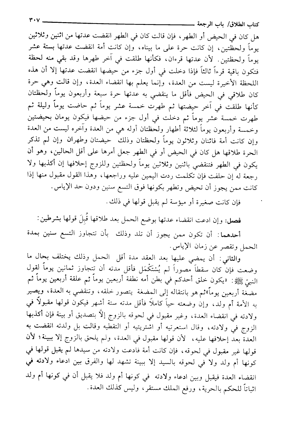 هَلْ كَانَ فِي الْحَيْضِ أَوِ الطُّهْرِ، فَإِنْ قَالَتْ كَانَ فِي الطُّهْرِ انْقَضَتْ عِدَّتُهَا مِنَ اثْنَيْنِ وَثَلَاثِينَ يَوْمًا وَلَحْظَتَيْنِ. إِنْ كَانَتْ حُرَّةً عَلَى مَا بَيَّنَاهُ، وَإِنْ كَانَتْ أَمَةً انْقَضَتْ عِدَّتُهَا بِسِتَّةَ عَشَرَ يَوْمًا وَلَحْظَتَيْنِ. لِأَنَّ عِدَّتَهَا قُرْءَانِ، فَكَأَنَّهَا طُلِّقَتْ فِي آخِرِ طُهْرِهَا وَقَدْ بَقِيَ مِنْهُ لَحْظَةٌ فَتَكُونُ بَاقِيَةً قُرْءًا ثَالِثًا فَإِذَا دَخَلَتْ فِي أَوَّلِ جُزْءٍ مِنْ حَيْضِهَا انْقَضَتْ عِدَّتُهَا إِلَّا أَنَّ هَذِهِ اللَّحْظَةَ الْأَخِيرَةَ لَيْسَتْ مِنَ الْعِدَّةِ، وَإِنَّمَا يُعْلَمُ بِهَا انْقِضَاءُ الْعِدَّةِ، وَإِنْ قَالَتْ وَهِيَ حُرَّةٌ كَانَ طَلَاقِي فِي الْحَيْضِ فَأَقَلُّ مَا يَنْقَضِي بِهِ عِدَّتُهَا حُرَّةً سَبْعَةٌ وَأَرْبَعُونَ يَوْمًا وَلَحْظَتَانِ كَأَنَّهَا طُلِّقَتْ فِي آخِرِ حَيْضَتِهَا ثُمَّ طَهُرَتْ خَمْسَةَ عَشَرَ يَوْمًا ثُمَّ حَاضَتْ يَوْمًا وَلَيْلَةً ثُمَّ طَهُرَتْ خَمْسَةَ عَشَرَ يَوْمًا ثُمَّ دَخَلَتْ فِي أَوَّلِ جُزْءٍ مِنْ حَيْضِهَا فَيَكُونُ يَوْمَانِ بِحَيْضَتَيْنِ وَخَمْسَةٌ وَأَرْبَعُونَ يَوْمًا لِثَلَاثَةِ أَطْهَارٍ وَلَحْظَتَانِ أَوَّلُهُ هِيَ مِنَ الْعِدَّةِ وَآخِرُهُ لَيْسَتْ مِنَ الْعِدَّةِ وَإِنْ كَانَتْ أَمَةً فَاثْنَانِ وَثَلَاثُونَ يَوْمًا وَلَحْظَتَانِ وَذَلِكَ حَيْضَتَانِ وَطُهْرَانِ وَإِنْ لَمْ تَذْكُرِ الْحُرَّةُ طَلَاقَهَا هَلْ كَانَ فِي الْحَيْضِ أَوْ فِي الطُّهْرِ جُعِلَ أَمْرُهَا عَلَى أَقَلِّ الْحَالَيْنِ، وَهُوَ أَنْ يَكُونَ فِي الطُّهْرِ فَتَنْقَضِيَ بِاثْنَيْنِ وَثَلَاثِينَ يَوْمًا وَلَحْظَتَيْنِ وَلِلزَّوْجِ إِحْلَافُهَا إِنْ أَكْذَبَهَا وَلَا رَجْعَةَ لَهُ إِنْ حَلَفَتْ فَإِنْ تَكَلَّمَتْ رُدَّتِ الْيَمِينُ عَلَيْهِ وَرَاجَعَهَا، وَهَذَا الْقَوْلُ مَقْبُولٌ مِنْهَا إِذَا كانت ممن يجوز أن تحيض وتطهر وَتَطْهُرَ بِكَوْنِهَا فَوْقَ التِّسْعِ سِنِينَ وَدُونَ حَدِّ الإياس.