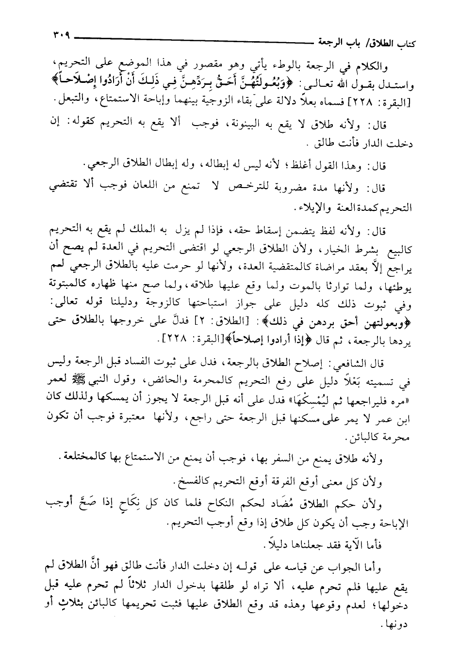قَالَ الشَّافِعِيُّ: إِصْلَاحُ الطَّلَاقِ بِالرَّجْعَةِ، فَدَلَّ عَلَى ثُبُوتِ الْفَسَادِ قَبْلَ الرَّجْعَةِ وَلَيْسَ فِي تَسْمِيَتِهِ بَعْلًا دَلِيلٌ عَلَى رَفْعِ التَّحْرِيمِ كَالْمُحَرَّمَةِ وَالْحَائِضِ، وَقَوْلُ النَّبِيِّ - صَلَّى اللَّهُ عَلَيْهِ وَسَلَّم َ - لِعُمْرَ (مُرْهُ فَلْيُرَاجِعْهَا ثُمَّ لِيُمْسِكْهَا) فَدَلَّ عَلَى أَنَّهُ قَبْلَ الرَّجْعَةِ لَا يَجُوزُ أَنْ يُمْسِكَهَا وَلِذَلِكَ كَانَ ابْنُ عُمَرَ لَا يَمُرُّ عَلَى مَسْكَنِهَا قَبْلَ الرَّجْعَةِ حَتَّى رَاجَعَ، وَلِأَنَّهَا مُعْتَبَرَةٌ فَوَجَبَ أَنْ تَكُونَ مُحَرَّمَةً كَالْبَائِنِ.