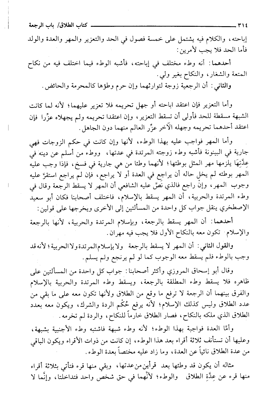 إِبَاحَتِهِ، وَالْكَلَامُ فِيهِ يَشْتَمِلُ عَلَى خَمْسَةِ فُصُولٍ فِي الْحَدِّ وَالتَّعْزِيرِ وَالْمَهْرِ وَالْعِدَّةِ وَالْوَلَدِ فَأَمَّا الْحَدُّ فَلَا يَجِبُ لِأَمْرَيْنِ:
