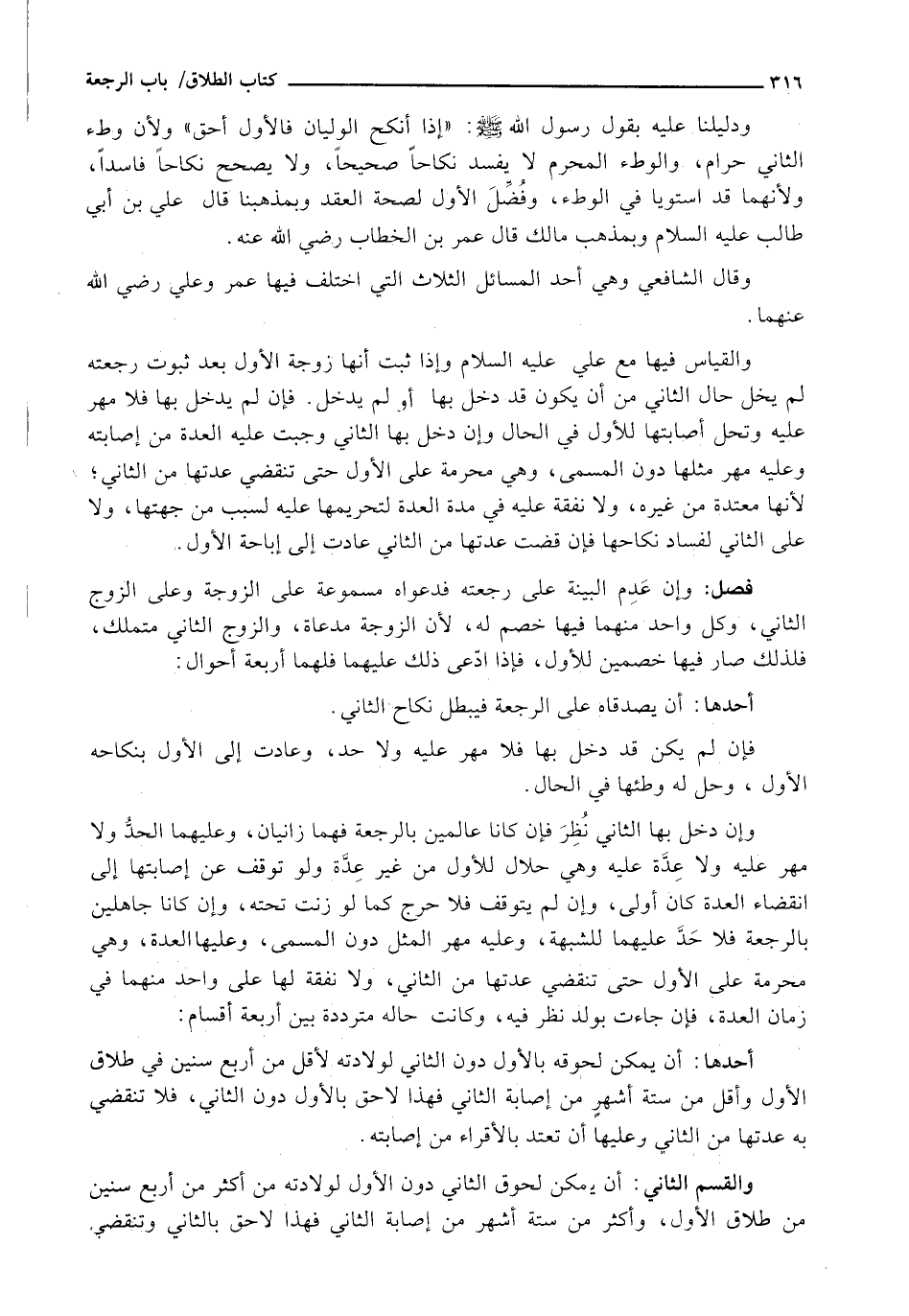 وَالْقِيَاسُ فِيهَا مَعَ عَلِيٍّ عَلَيْهِ السَّلَامُ وَإِذَا ثَبَتَ أَنَّهَا زَوْجَةُ الْأَوَّلِ بَعْدَ ثُبُوتِ رَجْعَتِهِ لَمْ يَخْلُ حَالُ الثَّانِي مِنْ أَنْ يَكُونَ قَدْ دَخَلَ بِهَا أَوْ لَمْ يَدْخُلْ. فَإِنْ لَمْ يَدْخُلْ بِهَا فَلَا مَهْرَ عَلَيْهِ وَتَحِلُّ أَصَابَتُهَا لِلْأَوَّلِ فِي الْحَالِ وَإِنْ دَخَلَ بِهَا الثَّانِي وَجَبَتْ عَلَيْهِ الْعِدَّةُ مِنْ إِصَابَتِهِ وَعَلَيْهِ مَهْرُ مِثْلِهَا دُونَ الْمُسَمَّى، وَهِيَ مُحَرَّمَةٌ عَلَى الْأَوَّلِ حَتَّى تَنْقَضِيَ عِدَّتُهَا من الثاني؛ لأنها معتدة في غَيْرِهِ، وَلَا نَفَقَةَ عَلَيْهِ فِي مُدَّةِ الْعِدَّةِ لِتَحْرِيمِهَا عَلَيْهِ لِسَبَبٍ مِنْ جِهَتِهَا، وَلَا عَلَى الثَّانِي لِفَسَادِ نِكَاحِهَا فَإِنْ قَضَتْ عِدَّتَهَا مِنَ الثاني عادة إِلَى إِبَاحَةِ الْأَوَّلِ.