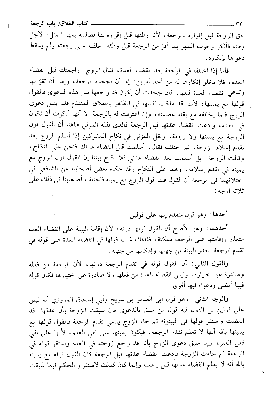 فَأَمَّا إِذَا اخْتَلَفَا فِي الرَّجْعَةِ بَعْدَ انْقِضَاءِ الْعِدَّةِ، فَقَالَ الزَّوْجُ: رَاجَعْتُكِ قَبْلَ انْقِضَاءِ الْعِدَّةِ، فَلَا يَخْلُو إِنْكَارُهَا لَهُ مِنْ أَحَدِ أَمْرَيْنِ: إِمَّا أَنْ تَجْحَدَهُ الرَّجْعَةَ، وَإِمَّا أَنْ تُقِرَّ بِهَا وَتَدَّعِيَ انْقِضَاءَ الْعِدَّةِ قَبْلَهَا، فَإِنْ جَحَدَتْ أَنْ يَكُونَ قَدْ رَاجَعَهَا قَبْلَ هَذِهِ الدَّعْوَى فَالْقَوْلُ قَوْلُهَا مَعَ يَمِينِهَا، لِأَنَّهَا قَدْ مَلَكَتْ نَفْسَهَا فِي الظَّاهِرِ بِالطَّلَاقِ الْمُتَقَدِّمِ فَلَمْ يُقْبَلْ دَعْوَى الزَّوْجِ فِيمَا يُخَالِفُهُ مَعَ بَقَاءِ عِصْمَتِهِ، وَإِنِ اعْتَرَفَتْ لَهُ بِالرَّجْعَةِ إِلَّا أَنَّهَا أَنْكَرَتْ أَنْ تَكُونَ فِي الْعِدَّةِ، وَادَّعَتِ انْقِضَاءَ عِدَّتِهَا قَبْلَ الرَّجْعَةِ فَالَّذِي نَقَلَهُ الْمُزَنِيُّ هَاهُنَا أَنَّ الْقَوْلَ قَوْلُ الزَّوْجَةِ مَعَ يَمِينِهَا وَلَا رَجْعَةَ، وَنَقَلَ الْمُزَنِيُّ فِي نِكَاحِ الْمُشْرِكِينَ إِذَا أَسْلَمَ الزَّوْجُ بعد تقدم إسلام الزوجة، ثم اختلف فَقَالَ: أَسْلَمْتِ قَبْلَ انْقِضَاءِ عِدَّتِكِ فَنَحْنُ عَلَى النِّكَاحِ، وَقَالَتِ الزَّوْجَةُ: بَلْ أَسْلَمْتَ بَعْدَ انْقِضَاءِ عِدَّتِي فَلَا نِكَاحَ بَيْنَنَا إِنَّ الْقَوْلَ قَوْلُ الزَّوْجِ مَعَ يَمِينِهِ فِي تَقَدُّمِ إِسْلَامِهِ، وَهُمَا عَلَى النِّكَاحِ وَقَدْ حَكَاهُ بَعْضُ أَصْحَابِنَا عَنِ الشَّافِعِيِّ فِي اخْتِلَافِهِمَا فِي الرَّجْعَةِ أَنَّ الْقَوْلَ فِيهَا قَوْلُ الزَّوْجِ مَعَ يَمِينِهِ فَاخْتَلَفَ أَصْحَابُنَا فِي ذَلِكَ عَلَى ثَلَاثَةِ أَوْجُهٍ: