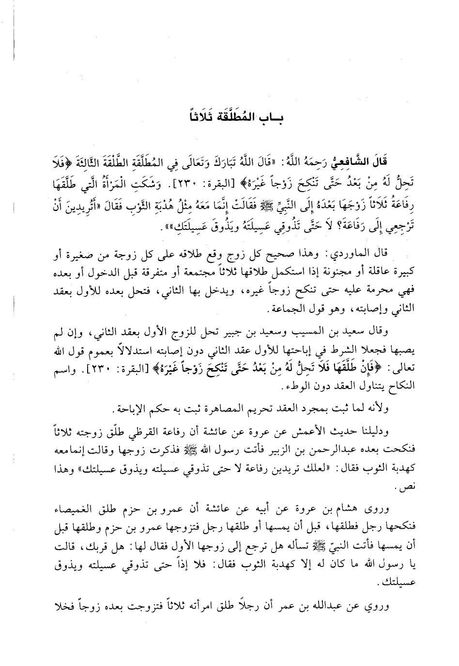 قَالَ الشَّافِعِيُّ رَحِمَهُ اللَّهُ: (قَالَ اللَّهُ تَبَارَكَ وَتَعَالَى فِي الْمُطَلَّقَةِ الطَّلْقَةَ الثَّالِثَةَ: {فَلا تَحِلُّ لَهُ مِنْ بَعْدُ حَتَّى تَنْكِحَ زَوْجًا غَيْرَهُ} [البقرة: 230] . وَشَكَتِ الْمَرْأَةُ الَّتِي طَلَّقَهَا رِفَاعَةُ ثَلَاثًا زَوْجَهَا بَعْدَهُ إِلَى النَّبِيِّ - صَلَّى اللَّهُ عَلَيْهِ وَسَلَّم َ - فَقَالَتْ إِنَّمَا مَعَهُ مِثْلُ هُدْبَةِ الثَّوْبِ فَقَالَ (أَتُرِيدِينَ أَنْ تَرْجِعِي إِلَى رِفَاعَةَ؟ لَا حَتَّى تَذُوقِي عُسَيْلَتَهُ وَيَذُوقَ عُسَيْلَتَكِ)) .