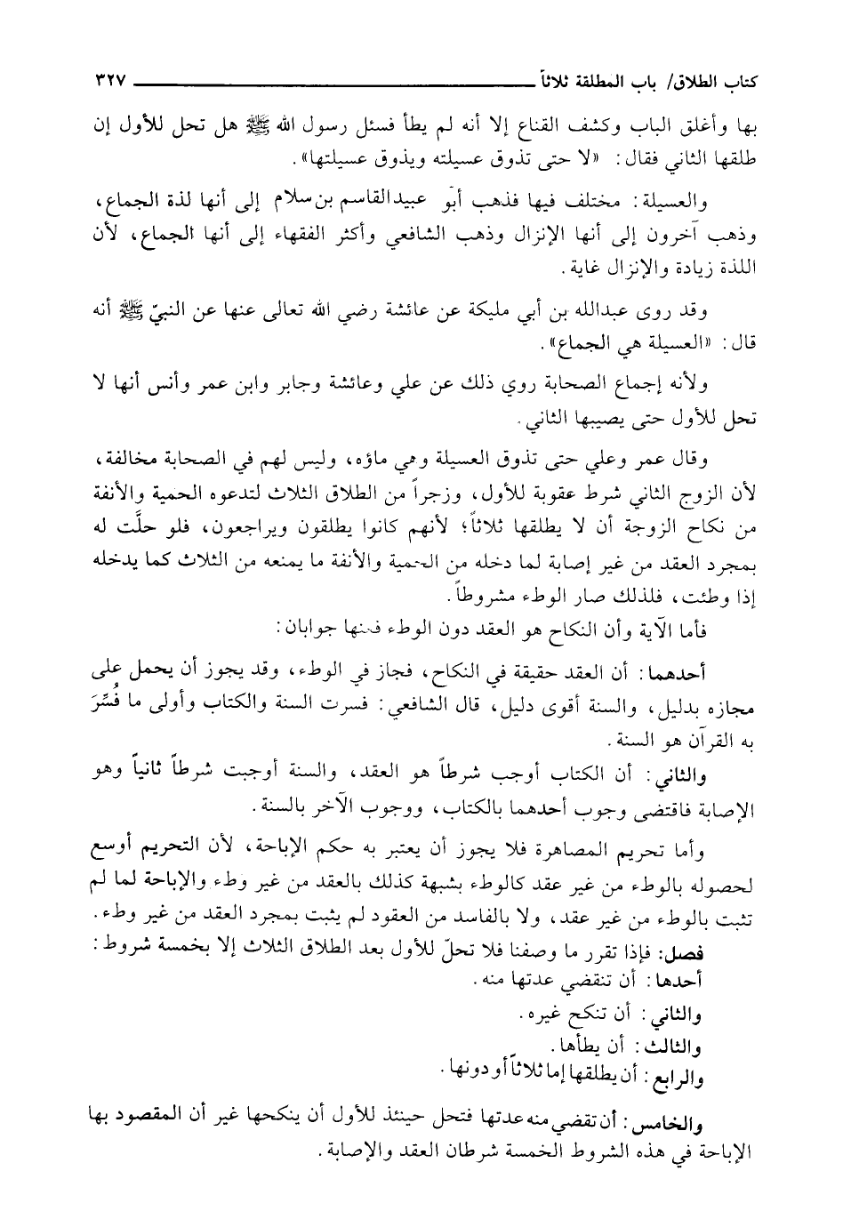 وَالْخَامِسُ: أَنْ تَقْضِيَ مِنْهُ عِدَّتَهَا فَتَحِلَّ حِينَئِذٍ لِلْأَوَّلِ أَنْ يَنْكِحَهَا غَيْرَ أَنَّ الْمَقْصُودَ بِهَا الْإِبَاحَةُ فِي هَذِهِ الشُّرُوطِ الْخَمْسَةِ شَرْطَانِ الْعَقْدُ وَالْإِصَابَةُ.