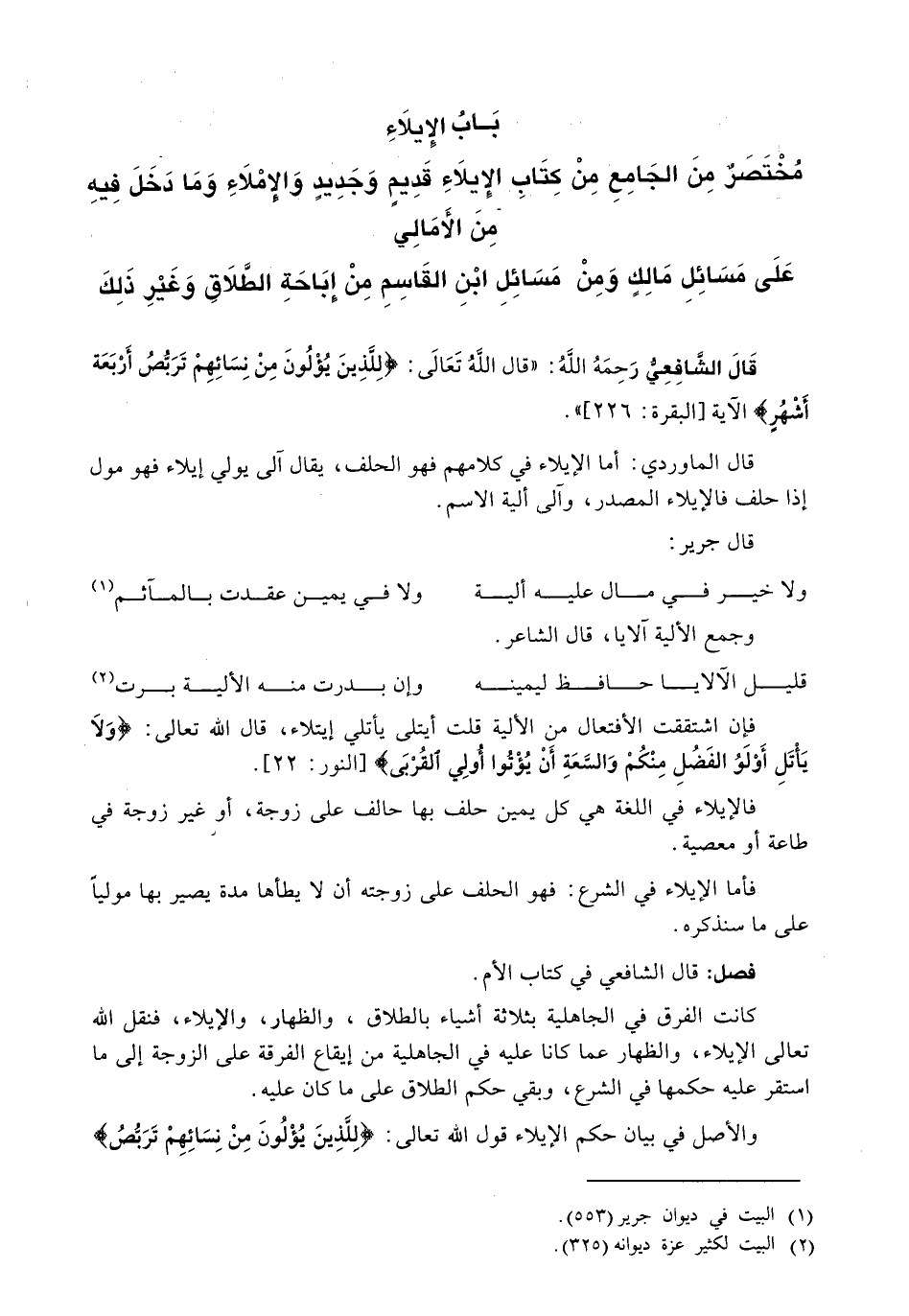قَالَ الشَّافِعِيُّ رَحِمَهُ اللَّهُ: (قَالَ اللَّهُ تَعَالَى: {لِلَّذِينَ يُؤْلُونَ مِنْ نِسَائِهِمْ تَرَبُّصُ أَرْبَعَةِ أَشْهُرٍ} الآية [البقرة: 226] ) .