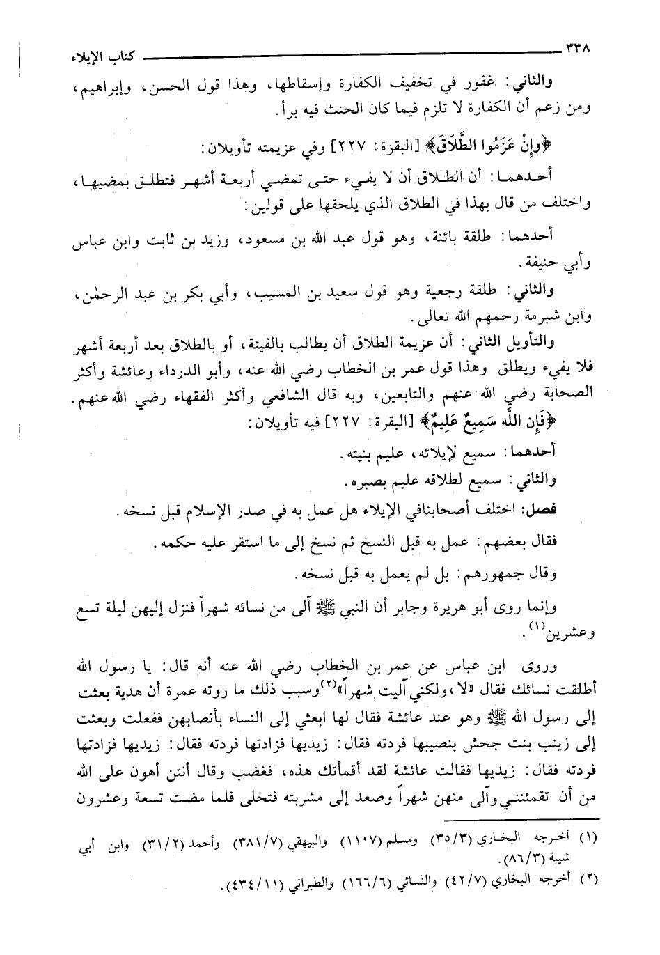 وَالتَّأْوِيلُ الثَّانِي: أَنَّ عَزِيمَةَ الطَّلَاقِ أَنْ يُطَالَبَ بِالْفَيْئَةِ، أَوْ بِالطَّلَاقِ بَعْدَ أَرْبَعَةِ أَشْهُرٍ فَلَا يَفِيءُ وَيُطَلِّقُ وَهَذَا قَوْلُ عُمَرَ بْنِ الْخَطَّابِ رَضِيَ اللَّهُ عَنْهُ، وأبو الدَّرْدَاءِ وَعَائِشَةَ وَأَكْثَرِ الصَّحَابَةِ رَضِيَ اللَّهُ عَنْهُمْ وَالتَّابِعِينَ، وَبِهِ قَالَ الشَّافِعِيُّ وَأَكْثَرُ الْفُقَهَاءِ رَضِيَ اللَّهُ عَنْهُمْ. {فَإِنَّ اللَّهَ سَمِيعٌ عَلِيمٌ} [البقرة: 227] فِيهِ تَأْوِيلَانِ: