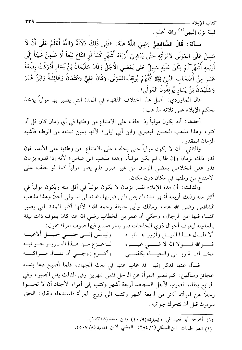 قال الشافعي رضي الله عنه: (فَفِي ذَلِكَ دَلَالَةٌ وَاللَّهُ أَعْلَمُ عَلَى أَنْ لَا سَبِيلَ عَلَى الْمُولِي لِامْرَأَتِهِ حَتَّى يَمْضِيَ أَرْبَعَةُ أَشْهُرٍ كَمَا لَوِ ابْتَاعَ بَيْعًا أَوْ ضَمِنَ شَيْئًا إِلَى أَرْبَعَةِ أَشْهُرٍ لَمْ يَكُنْ عليه سبيل حتى يمضي الأجل وقال سليمان بن سار أدركت بضعة عشر مِنْ أَصْحَابِ النَّبِيِّ - صَلَّى اللَّهُ عَلَيْهِ وَسَلَّم َ - كلهم يوقف المولى. وكان علي وعثمان وعائشة وابن عمر وسليمان بن يسار يوقفون المولى) .