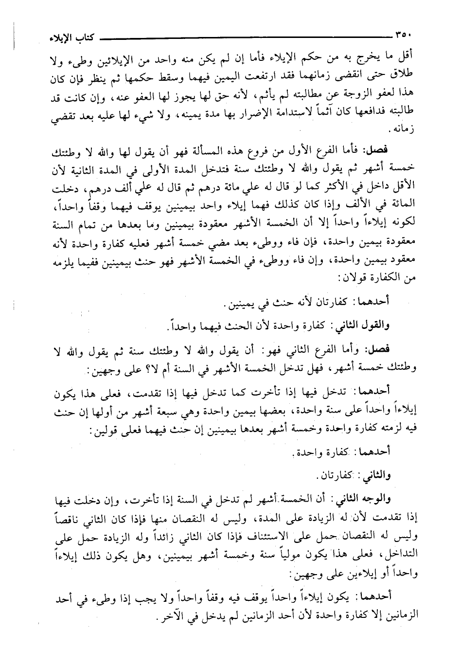 فَأَمَّا الْفَرْعُ الْأَوَّلُ مِنْ فُرُوعِ هَذِهِ الْمَسْأَلَةِ فَهُوَ أَنْ يَقُولَ لَهَا وَاللَّهِ لَا وَطِئْتُكِ خَمْسَةَ أَشْهُرٍ ثُمَّ يَقُولُ وَاللَّهِ لَا وَطِئْتُكِ سَنَةً فَتَدْخُلُ الْمُدَّةُ الْأُولَى فِي الْمُدَّةِ الثَّانِيَةِ لِأَنَّ الْأَقَلَّ دَاخِلٌ فِي الْأَكْثَرِ كَمَا لَوْ قَالَ لَهُ عَلَيَّ مِائَةُ دِرْهَمٍ ثُمَّ قَالَ لَهُ عَلَيَّ أَلْفُ دِرْهَمٍ، دَخَلَتِ الْمِائَةُ فِي الْأَلْفِ وَإِذَا كَانَ كَذَلِكَ فَهُمَا إِيلَاءٌ وَاحِدٌ بيمينين يوقف فيهما وقفاً واحدا لكونه إيلاءا وَاحِدًا إِلَّا أَنَّ الْخَمْسَةَ الْأَشْهُرِ مَعْقُودَةٌ بِيَمِينَيْنِ وَمَا بَعْدَهَا مِنْ تَمَامِ السَّنَةِ مَعْقُودَةٌ بِيَمِينِ وَاحِدَةٍ، فَإِنْ فَاءَ وَوَطِئَ بَعْدَ مُضِيِّ خَمْسَةِ أشهر عليه كفارة وادة لأنه معقودة بِيَمِينِ وَاحِدَةٍ، وَإِنْ فَاءَ وَوَطِئَ فِي الْخَمْسَةِ الْأَشْهُرِ فَهُوَ حِنْثٌ بِيَمِينَيْنِ فَفِيمَا يَلْزَمُهُ مِنَ الْكَفَّارَةِ قَوْلَانِ: