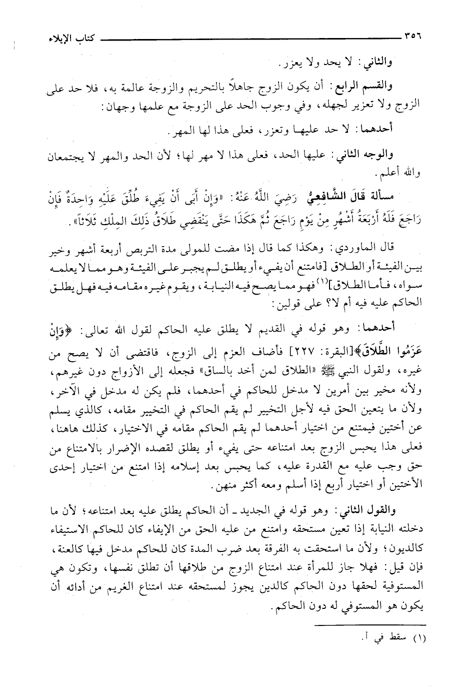 أَحَدُهُمَا: وَهُوَ قَوْلُهُ فِي الْقَدِيمِ لَا يُطَلِّقُ عَلَيْهِ الْحَاكِمُ لِقَوْلِ اللَّهِ تَعَالَى: {وَإِنْ عَزَمُوا الطَّلاقَ} [البقرة: 227] فَأَضَافَ الْعَزْمَ إِلَى الزَّوْجِ، فَاقْتَضَى أَنْ لَا يَصِحَّ من غيره، لقول النبي - صَلَّى اللَّهُ عَلَيْهِ وَسَلَّم َ - (الطلاق لمن أخذ بِالسَّاقِ) فَجَعَلَهُ إِلَى الْأَزْوَاجِ دُونَ غَيْرِهِمْ، وَلِأَنَّهُ مُخَيَّرٌ بَيْنَ أَمْرَيْنِ لَا مَدْخَلَ لِلْحَاكِمِ فِي أَحَدِهِمَا، فَلَمْ يَكُنْ لَهُ مَدْخَلٌ فِي الْآخَرِ، وَلِأَنَّ مَا يَتَعَيَّنُ الْحَقُّ فِيهِ لِأَجْلِ التَّخْيِيرِ لَمْ يَقُمِ الْحَاكِمُ فِي التَّخْيِيرِ مَقَامَهُ، كَالَّذِي يسلم عغن أُخْتَيْنِ فَيَمْتَنِعُ مِنَ اخْتِيَارِ أَحَدِهِمَا لَمْ يَقُمِ الْحَاكِمُ مَقَامَهُ فِي الِاخْتِيَارِ، كَذَلِكَ هَاهُنَا، فَعَلَى هَذَا يُحْبَسُ الزَّوْجُ بَعْدَ امْتِنَاعِهِ حَتَّى يَفِيءَ أَوْ يُطَلِّقَ لِقَصْدِهِ الْإِضْرَارَ بِالِامْتِنَاعِ مِنْ حَقٍّ وَجَبَ عَلَيْهِ مَعَ الْقُدْرَةِ عَلَيْهِ، كَمَا يُحْبَسُ بَعْدَ إِسْلَامِهِ إِذَا امْتَنَعَ مِنَ اخْتِيَارِ إِحْدَى الْأُخْتَيْنِ أَوِ اخْتِيَارِ أَرْبَعٍ إِذَا أَسْلَمَ وَمَعَهُ أَكْثَرُ مِنْهُنَّ.
