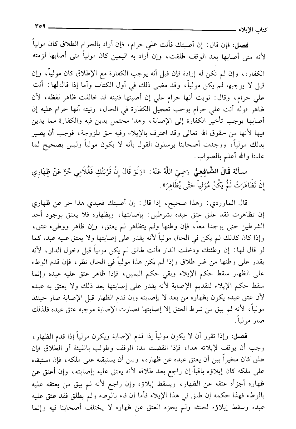 قال المارودي: وَهَذَا صَحِيحٌ، إِذَا قَالَ: إِنْ أَصَبْتُكِ فَعَبْدِي هَذَا حَرٌّ عَنْ ظِهَارِي إِنْ تَظَاهَرْتُ فَقَدْ عَلَّقَ عِتْقَ عَبْدِهِ بِشَرْطَيْنِ: بِإِصَابَتِهَا، وَبِظِهَارِهِ فَلَا يَعْتِقُ بِوُجُودِ أَحَدِ الشَّرْطَيْنِ حَتَّى يُوجَدَا مَعًا، فَإِنْ وَطِئَهَا وَلَمْ يَتَظَاهَرْ لَمْ يُعْتَقْ، وَإِنْ ظَاهَرَ وَوَطِئَ عَتِقَ، وَإِذَا كَانَ كَذَلِكَ لَمْ يَكُنْ فِي الْحَالِ مُولِيًا لِأَنَّهُ يَقْدِرُ عَلَى إِصَابَتِهَا وَلَا يَعْتِقُ عَلَيْهِ عَبْدُهُ كَمَا لَوْ قال لها: إن وطتئك وَدَخَلْتُ الدَّارَ فَأَنْتِ طَالِقٌ لَمْ يَكُنْ مُولِيًا قَبْلَ دُخُولِ الدَّارِ لِأَنَّهُ يَقْدِرُ عَلَى وَطْئِهَا مِنْ غَيْرِ طَلَاقٍ وَإِذَا لَمْ يَكُنْ هَذَا مُولِيًا فِي الْحَالِ نُظِرَ، فَإِنْ قَدَّمَ الْوَطْءَ عَلَى الظِّهَارِ سَقَطَ حُكْمُ الْإِيلَاءِ وَبَقِيَ حُكْمُ الْيَمِينِ، فَإِذَا ظَاهَرَ عَتَقَ عَلَيْهِ عَبْدُهُ وَإِنَّمَا سَقَطَ حُكْمُ الْإِيلَاءِ لِتَقْدِيمِ الْإِصَابَةِ لِأَنَّهُ يَقْدِرُ عَلَى إِصَابَتِهَا بَعْدَ ذَلِكَ وَلَا يَعْتِقُ بِهِ عَبْدُهُ لِأَنَّ عِتْقَ عَبْدِهِ يَكُونُ بِظِهَارِهِ مِنْ بَعْدُ لَا بِإِصَابَتِهِ وَإِنْ قَدَّمَ الظِّهَارَ قَبْلَ الْإِصَابَةِ صَارَ حِينَئِذٍ مُولِيًا، لِأَنَّهُ لَمْ يَبْقَ مِنْ شَرْطِ الْعِتْقِ إِلَّا إِصَابَتُهَا فَصَارَتِ الْإِصَابَةُ مُوجِبَةً عِتْقَ عَبْدِهِ فَلِذَلِكَ صَارَ مُولِيًا.
