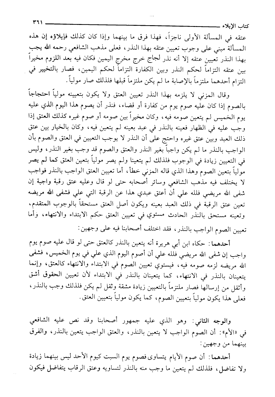 وَقَالَ الْمُزَنِيُّ لَا يَلْزَمُهُ بِهَذَا النَّذْرِ تَعْيِينُ الْعِتْقِ وَلَا يَكُونُ بِتَعْيِينِهِ مُولِيًا احْتِجَاجًا بِالصَّوْمِ إِذَا كَانَ عَلَيْهِ صَوْمُ يَوْمٍ مِنْ كَفَّارَةٍ أَوْ قَضَاءٍ، فَنَذَرَ أَنْ يَصُومَ هَذَا الْيَوْمَ الَّذِي عَلَيْهِ يَوْمَ الْخَمِيسِ لَمْ يَتَعَيَّنْ صَوْمُهُ فِيهِ، وَكَانَ مُخَيَّرًا بَيْنَ صَوْمِهِ أَوْ صَوْمِ غَيْرِهِ كَذَلِكَ الْعِتْقُ إِذَا وَجَبَ عَلَيْهِ فِي الظِّهَارِ فَعَيَّنَهُ بِالنَّذْرِ فِي عَبْدٍ بِعَيْنِهِ لَمْ يَتَعَيَّنْ فِيهِ، وَكَانَ بِالْخِيَارِ بَيْنَ عِتْقِ ذَلِكَ الْعَبْدِ وَبَيْنَ عِتْقِ غَيْرِهِ وَاحْتُجَّ عَلَى أَنَّ النَّذْرَ لَا يُوجِبُ التَّعْيِينَ فِي الْعِتْقِ وَالصَّوْمِ بِأَنَّ الْوَاجِبَ بِالنَّذْرِ مَا لَمْ يَكُنْ وَاجِبًا بِغَيْرِ النَّذْرِ وَالْعِتْقِ وَالصَّوْمِ قَدْ وَجَبَ بِغَيْرِ النَّذْرِ، وَلَيْسَ فِي التَّعْيِينِ زِيَادَةٌ فِي الْوُجُوبِ فَلِذَلِكَ لَمْ يَتَعَيَّنَا وَلَمْ يَصِرْ مُولِيًا بِتَعْيِنِ الْعِتْقِ كَمَا لَمْ يَصِرْ مُولِيًا بِتَعْيِنِ الصَّوْمِ وَهَذَا الَّذِي قَالَهُ الْمُزَنِيُّ خَطَأٌ، أَمَّا تَعْيِينُ الْعِتْقِ الْوَاجِبِ بِالنَّذْرِ فَوَاجِبٌ لَا يَخْتَلِفُ فِيهِ مَذْهَبُ الشَّافِعِيِّ وَسَائِرِ أَصْحَابِهِ حَتَّى لَوْ قَالَ وَعَلَيْهِ عِتْقُ رَقَبَةٍ وَاجِبَةٍ إِنْ شَفَى اللَّهُ مَرِيضِي فَلِلَّهِ عَلَيَّ أَنْ أَعْتِقَ عَبْدِيَ هَذَا عَنِ الرَّقَبَةِ الَّتِي عَلَيَّ فَشَفَى اللَّهُ مَرِيضَهُ تَعَيَّنَ عِتْقُ الرَّقَبَةِ فِي ذَلِكَ الْعَبْدِ بِعَيْنِهِ وَيَكُونُ أَصْلُ الْعِتْقِ مُسْتَحَقًّا بِالْوُجُوبِ الْمُتَقَدِّمِ، وَتَعْيِنُهُ مستحق بالنذر الحادث مستوي فِي تَعْيِينِ الْعِتْقِ حُكْمُ الِابْتِدَاءِ وَالِانْتِهَاءِ، وَأَمَّا تَعْيِينُ الصَّوْمِ الْوَاجِبِ بِالنَّذْرِ، فَقَدِ اخْتَلَفَ أَصْحَابُنَا فِيهِ عَلَى وَجْهَيْنِ: