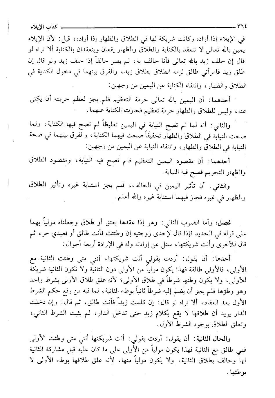 فِي الْإِيلَاءِ إِذَا أَرَادَهُ وَكَانَتْ شَرِيكَةً لَهَا فِي الطَّلَاقِ وَالظِّهَارِ إِذَا أَرَادَهُ، قِيلَ: لِأَنَّ الْإِيلَاءَ يَمِينٌ بِاللَّهِ تَعَالَى لَا تَنْعَقِدُ بِالْكِنَايَةِ وَالطَّلَاقُ وَالظِّهَارُ يَقَعَانِ وَيَنْعَقِدَانِ بِالْكِنَايَةِ أَلَا تَرَاهُ لَوْ قَالَ إِنْ حَلَفَ زَيْدٌ بِاللَّهِ تَعَالَى فَأَنَا حَالِفٌ بِهِ، لَمْ يَصِرْ حَالِفًا إِذَا حَلَفَ زَيْدٌ وَلَوْ قَالَ إِنْ طَلَّقَ زَيْدٌ فَامْرَأَتِي طَالِقٌ لَزِمَهُ الطَّلَاقُ بِطَلَاقِ زَيْدٍ، وَالْفَرْقُ بَيْنَهُمَا فِي دُخُولِ الْكِنَايَةِ فِي الطَّلَاقِ وَالظِّهَارِ، وَانْتِفَاءِ الْكِنَايَةِ عَنِ الْيَمِينِ مِنْ وَجْهَيْنِ: