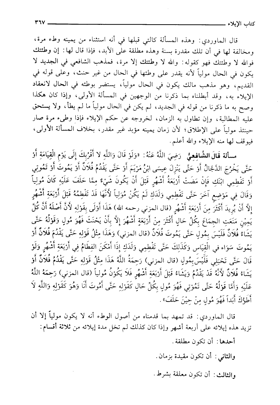 قال الشافعي رضي الله عنه: (وَلَوْ قَالَ وَاللَّهِ لَا أَقْرَبُكِ إِلَى يَوْمِ الْقِيَامَةِ أَوْ حَتَّى يَخْرُجَ الدَّجَّالُ أَوْ حَتَّى يَنْزِلَ عِيسَى ابْنُ مَرْيَمَ أَوْ حَتَّى يَقْدَمَ فُلَانٌ أَوْ يَمُوتَ أَوْ تَمُوتِي أَوْ تَفْطِمِي ابْنَكِ فَإِنْ مَضَتْ أَرْبَعَةُ أَشْهُرٍ قَبْلَ أَنْ يَكُونَ شَيْءٌ مِمَّا حَلَفَ عَلَيْهِ كَانَ مُولِيًا وَقَالَ فِي مَوْضِعٍ آخَرَ حَتَّى تَفْطِمِي وَلَدَكِ لَمْ يَكُنْ مُولِيًا لِأَنَّهَا قَدْ تَفْطِمُهُ قَبْلَ أَرْبَعَةِ أَشْهُرٍ إِلَّا أَنْ يُرِيدَ أَكْثَرَ مِنَ أَرْبَعَةِ أَشْهُرٍ (قَالَ الْمُزَنِيُّ رَحِمَهُ اللَّهُ) هَذَا أولى بقوله لأن أصله أَنَّ كُلَّ يَمِينٍ مَنَعَتِ الْجَمَاعَ بِكُلِّ حَالٍ اكثر من أربعة أشهر إلا بأن يحنث فهو مول وقوله حتى يشاء فلان فليس بمول حتى يموت فلان (قال المزني) وهذا مثل قوله حتى يقدم فلان أو يموت سواء في القياس وكذلك حتى تفطمي ولدك إذا أمكن الفطام في أربعة أشهر ولو قال حتى تحبلي فليس بمول (قال المزني) رحمه الله هذا مثل قوله حتى يقدم فلان أو يشاء فلان لأنه قد يقدم ويشاء قبل أربعة أشهر فلا يكون مولياً (قال المزني) رحمه الله عليه وأما قوله حتى تموتي فهو مول بكل حال كقوله حتى أموت أنا وهو كقوله والله لا أطؤك أبداً فهو مول من حين حلف) .
