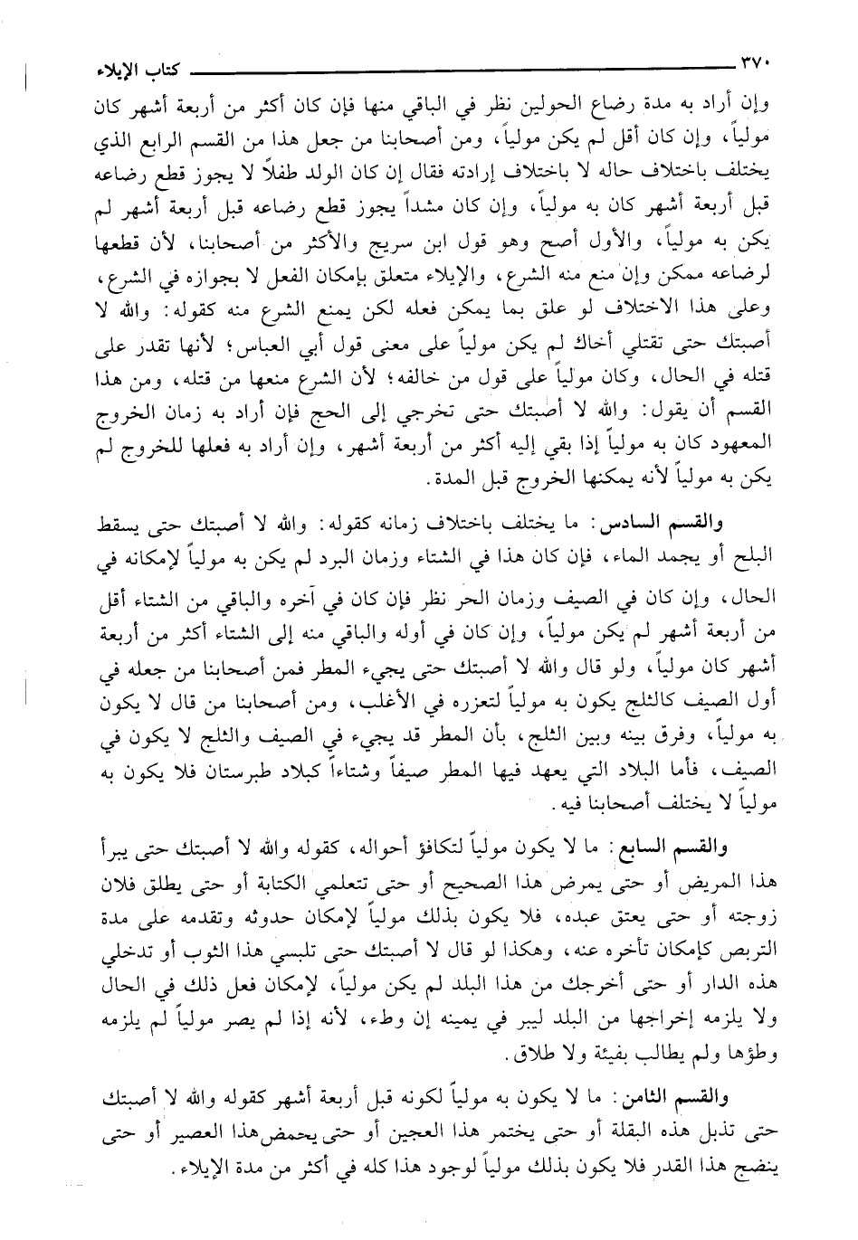 وَالْقِسْمُ السَّابِعُ: مَا لَا يَكُونُ مُولِيًا لِتَكَافُؤِ أَحْوَالِهِ، كَقَوْلِهِ وَاللَّهِ لَا أَصَبْتُكِ حَتَّى يَبْرَأَ هَذَا الْمَرِيضُ أَوْ حَتَّى يَمْرَضَ هَذَا الصَّحِيحُ أَوْ حَتَّى تَتَعَلَّمِي الْكِتَابَةَ أَوْ حَتَّى يُطَلِّقَ فُلَانٌ زَوْجَتَهُ أَوْ حَتَّى يَعْتِقَ عَبْدَهُ، فَلَا يَكُونُ بِذَلِكَ مُولِيًا لِإِمْكَانِ حُدُوثِهِ وَتَقَدُّمِهِ عَلَى مُدَّةِ التَّرَبُّصِ كَإِمْكَانِ تَأَخُّرِهِ عَنْهُ، وَهَكَذَا لَوْ قَالَ لَا أَصَبْتُكِ حَتَّى تَلْبَسِي هَذَا الثَّوْبَ أَوْ تَدْخُلِي هَذِهِ الدَّارَ أَوْ حَتَّى أُخْرِجَكِ مِنْ هَذَا الْبَلَدِ لَمْ يَكُنْ مُولِيًا، لِإِمْكَانِ فِعْلِ ذَلِكَ فِي الْحَالِ وَلَا يَلْزَمُهُ إِخْرَاجُهَا مِنَ الْبَلَدِ لِيَبَرَّ فِي يمينه إن وطء، لِأَنَّهُ إِذَا لَمْ يَصِرْ مُولِيًا لَمْ يَلْزَمْهُ وَطْؤُهَا وَلَمْ يُطَالَبْ بِفَيْئَةٍ وَلَا طَلَاقٍ.