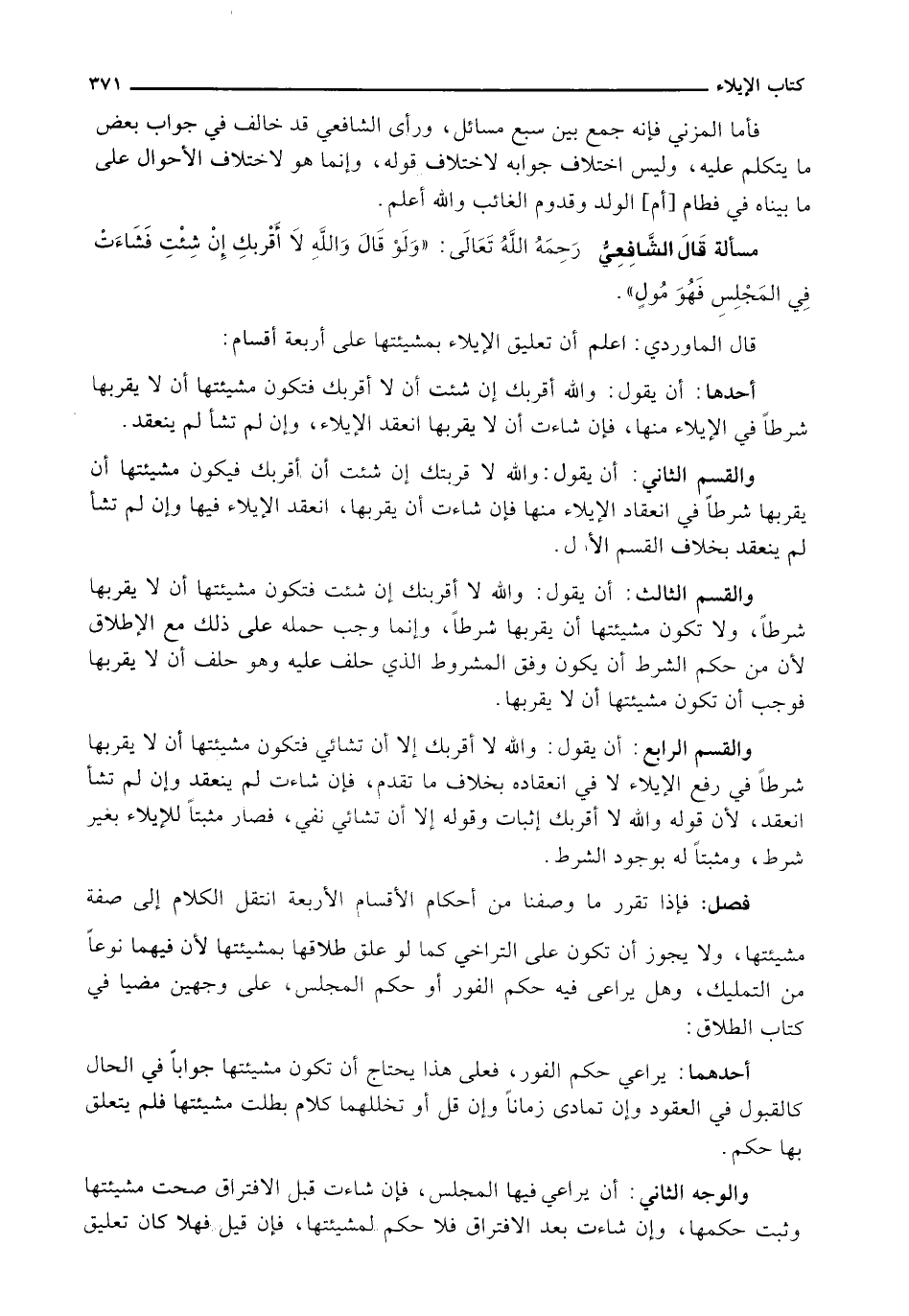 أحدها: أن يقول: والله لا أقربك إن شئت أن أَقْرَبَكِ فَتَكُونَ مَشِيئَتُهَا أَنْ لَا يَقْرَبَهَا شَرْطًا فِي الْإِيلَاءِ مِنْهَا، فَإِنْ شَاءَتْ أَنْ لَا يَقْرَبَهَا انْعَقَدَ الْإِيلَاءُ، وَإِنْ لَمْ تَشَأْ لَمْ يَنْعَقِدْ. وَالْقِسْمُ الثَّانِي: أَنْ يَقُولَ: وَاللَّهِ لَا قَرَبْتُكِ إِنْ شِئْتِ أَنْ أَقْرَبَكِ فَيَكُونَ مَشِيئَتُهَا أَنْ يَقْرَبَهَا شَرْطًا فِي انْعِقَادِ الْإِيلَاءِ مِنْهَا فَإِنْ شَاءَتْ أَنْ يَقْرَبَهَا، انْعَقَدَ الْإِيلَاءُ فِيهَا وَإِنْ لَمْ تَشَأْ لَمْ يَنْعَقِدْ بِخِلَافِ الْقِسْمِ الأول. لَمْ يَنْعَقِدْ بِخِلَافِ الْقِسْمِ الْأَوَّلِ.