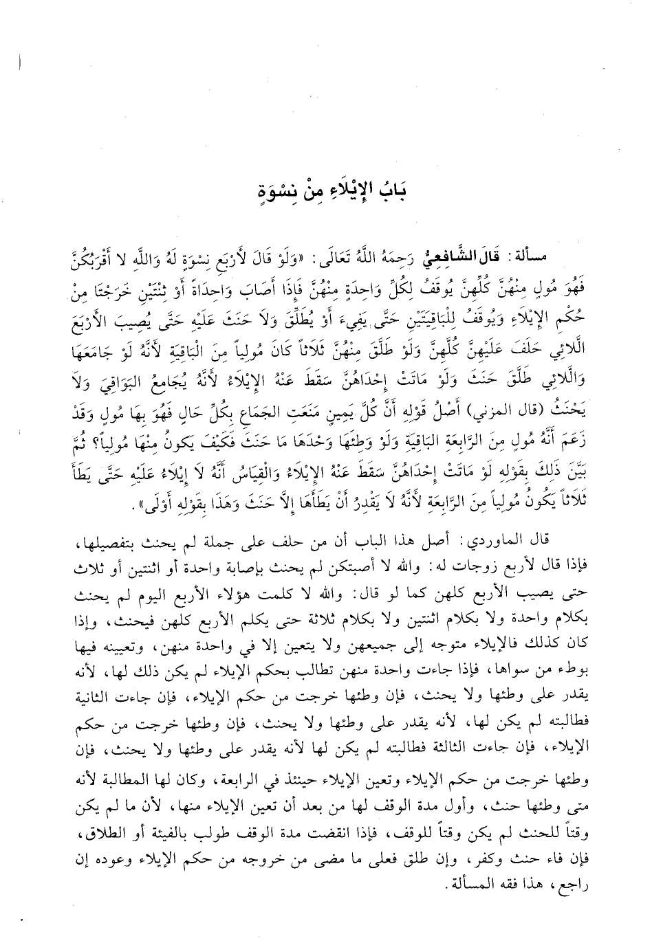 قَالَ الْمَاوَرْدِيُّ: أَصِلُ هَذَا الْبَابِ أَنَّ مَنْ حَلَفَ عَلَى جُمْلَةٍ لَمْ يَحْنَثْ بِتَفْصِيلِهَا، فَإِذَا قَالَ لِأَرْبَعِ زَوْجَاتٍ لَهُ: وَاللَّهِ لَا أَصَبْتُكُنَّ لَمْ يَحْنَثْ بِإِصَابَةِ وَاحِدَةٍ أَوِ اثْنَتَيْنِ أَوْ ثَلَاثٍ حَتَّى يُصِيبَ الْأَرْبَعَ كُلَّهُنَّ كَمَا لَوْ قال: والله لا كلمت هؤلاء االأربع الْيَوْمَ لَمْ يَحْنَثْ بِكَلَامِ وَاحِدَةٍ وَلَا بِكَلَامِ اثْنَتَيْنِ وَلَا بِكَلَامِ ثَلَاثَةٍ حَتَّى يُكَلِّمَ الْأَرْبَعَ كُلَّهُنَّ فَيَحْنَثَ، وَإِذَا كَانَ كَذَلِكَ فَالْإِيلَاءُ مُتَوَجِّهٌ إِلَى جَمِيعِهِنَّ وَلَا يَتَعَيَّنُ إِلَّا فِي وَاحِدَةٍ مِنْهُنَّ، وَتَعْيِينُهُ فِيهَا بِوَطْءِ مَنْ سِوَاهَا، فَإِذَا جَاءَتْ وَاحِدَةٌ مِنْهُنَّ تُطَالِبُ بِحُكْمِ الْإِيلَاءِ لَمْ يَكُنْ ذَلِكَ لَهَا، لِأَنَّهُ يَقْدِرُ عَلَى وَطْئِهَا وَلَا يَحْنَثُ، فَإِنْ وَطِئَهَا خَرَجَتْ مِنْ حُكْمِ الْإِيلَاءِ، فَإِنْ جَاءَتِ الثَّانِيَةُ فَطَالَبَتْهُ لَمْ يَكُنْ لَهَا، لِأَنَّهُ يَقْدِرُ عَلَى وَطْئِهَا وَلَا يَحْنَثُ، فَإِنْ وَطِئَهَا خَرَجَتْ مِنْ حُكْمِ الْإِيلَاءِ، فَإِنْ جَاءَتِ الثَّالِثَةُ فَطَالَبَتْهُ لَمْ يَكُنْ لَهَا لِأَنَّهُ يَقْدِرُ عَلَى وَطْئِهَا وَلَا يَحْنَثُ، فَإِنْ وَطِئَهَا خَرَجَتْ مِنْ حُكْمِ الْإِيلَاءِ وَتَعَيَّنَ الْإِيلَاءُ حِينَئِذٍ فِي الرَّابِعَةِ، وَكَانَ لَهَا الْمُطَالَبَةُ لِأَنَّهُ مَتَى وَطِئَهَا حَنِثَ، وَأَوَّلُ مُدَّةِ الْوَقْفِ لَهَا مِنْ بَعْدِ أَنْ تَعَيَّنَ الْإِيلَاءُ مِنْهَا، لِأَنَّ مَا لَمْ يَكُنْ وَقْتًا لِلْحِنْثِ لَمْ يَكُنْ وَقْتًا لِلْوَقْفِ، فَإِذَا انْقَضَتْ مُدَّةُ الْوَقْفِ طُولِبَ بِالْفَيْئَةِ أَوِ الطَّلَاقِ، فَإِنْ فَاءَ حَنِثَ وَكَفَّرَ، وَإِنْ طَلَّقَ فَعَلَى مَا مَضَى مِنْ خُرُوجِهِ مِنْ حكم الإيلاء وعوده إن راجع، هذا فقه المسألة.