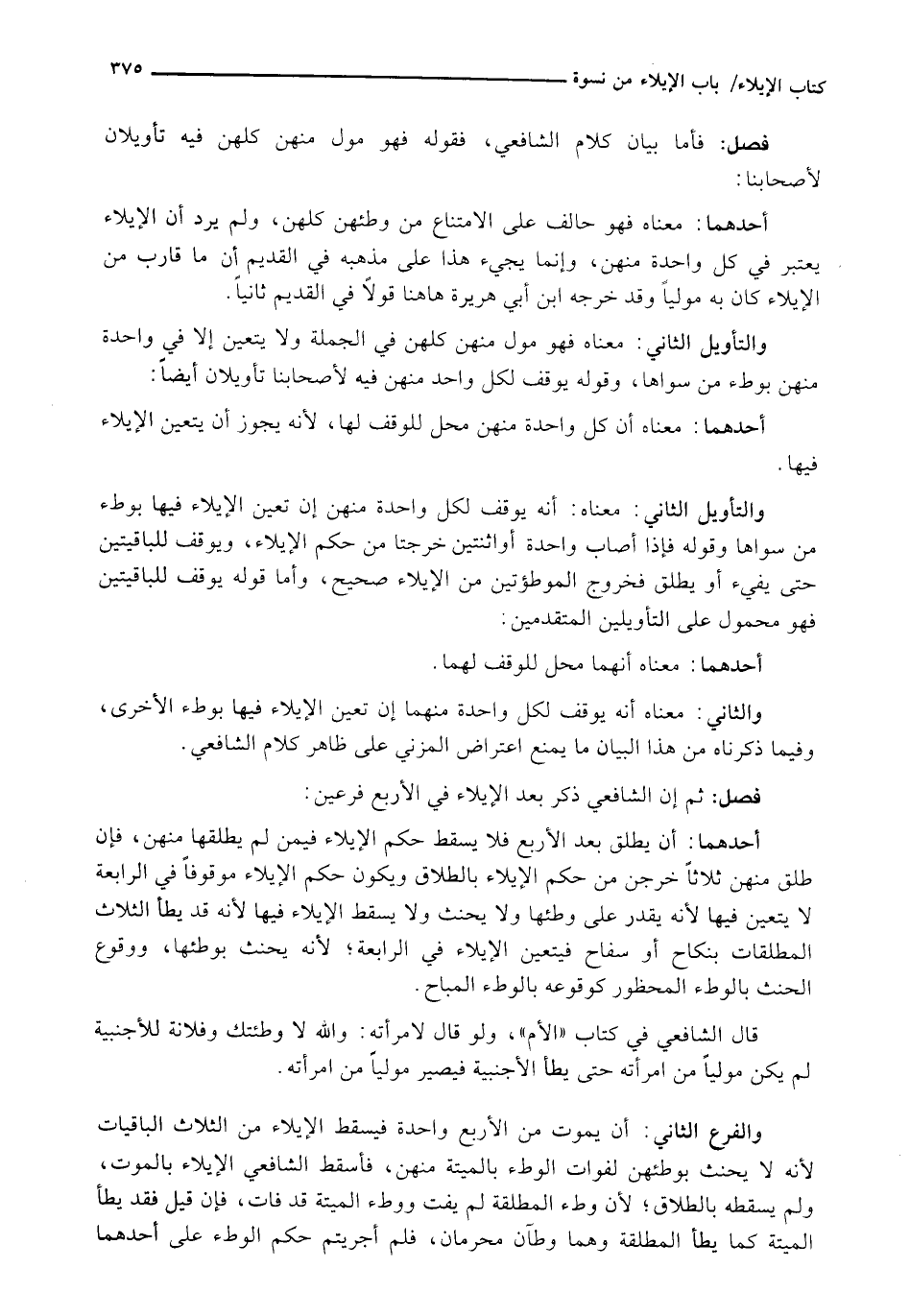 فَأَمَّا بَيَانُ كَلَامِ الشَّافِعِيِّ، فَقَوْلُهُ فَهُوَ مُولٍ مِنْهُنَّ كُلِّهُنَّ فِيهِ تَأْوِيلَانِ لِأَصْحَابِنَا: