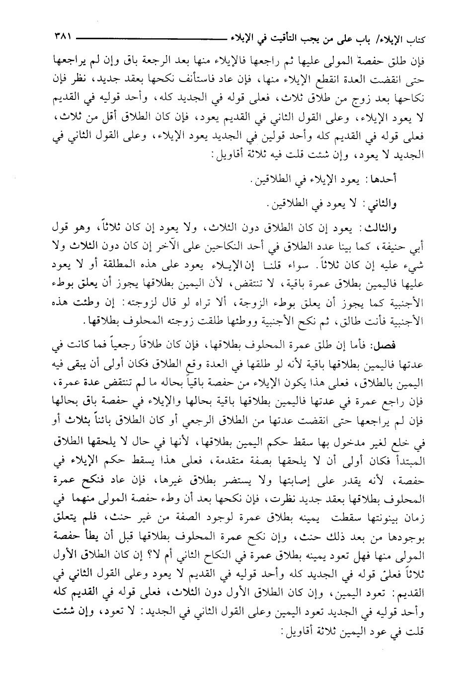 فَإِنْ طَلَّقَ حَفْصَةَ الْمُولَى عَلَيْهَا ثُمَّ رَاجَعَهَا فَالْإِيلَاءُ مِنْهَا بَعْدَ الرَّجْعَةِ بَاقٍ وَإِنْ لَمْ يُرَاجِعْهَا حَتَّى انْقَضَتِ الْعِدَّةُ انْقَطَعَ الْإِيلَاءُ مِنْهَا، فَإِنْ عَادَ فَاسْتَأْنَفَ نَكَحَهَا بِعَقْدٍ جَدِيدٍ، نُظِرَ فإن نكاحها بَعْدَ زَوْجٍ مِنْ طَلَاقِ ثَلَاثٍ، فَعَلَى قَوْلِهِ في الجديد كله، وأحد قوليه في القديم لَا يَعُودُ الْإِيلَاءُ، وَعَلَى الْقَوْلِ الثَّانِي فِي الْقَدِيمِ يَعُودُ، فَإِنْ كَانَ الطَّلَاقُ أَقَلَّ مِنْ ثَلَاثٍ، فَعَلَى قَوْلِهِ فِي الْقَدِيمِ كُلِّهِ وَأَحَدِ قَوْلَيْنِ فِي الْجَدِيدِ يَعُودُ الْإِيلَاءُ، وَعَلَى الْقَوْلِ الثَّانِي فِي الْجَدِيدِ لَا يَعُودُ، وَإِنْ شِئْتَ قُلْتَ فِيهِ ثَلَاثَةَ أَقَاوِيلَ: