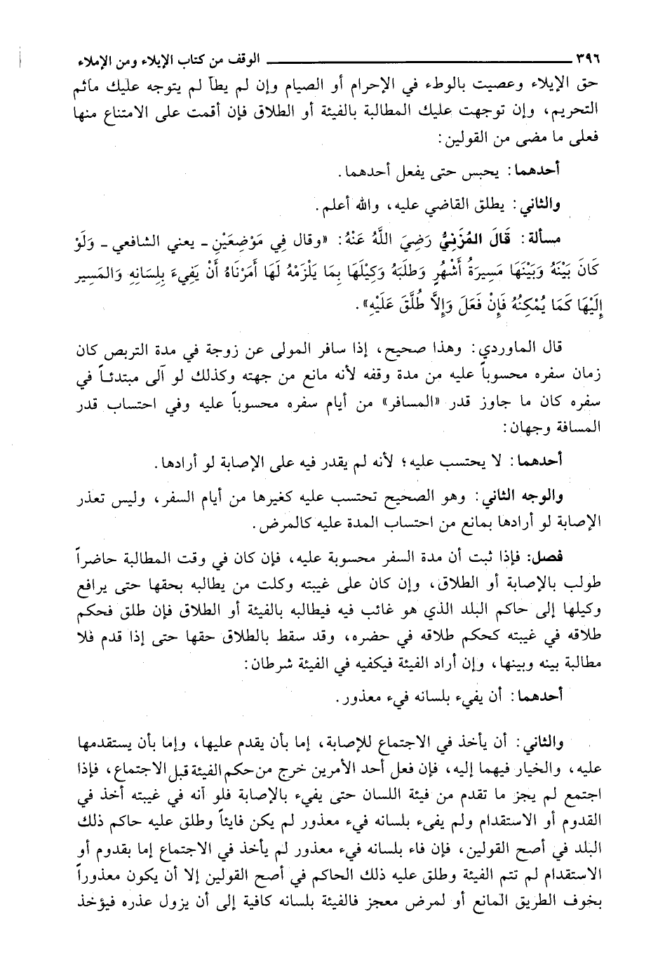قَالَ الْمَاوَرْدِيُّ: وَهَذَا صَحِيحٌ، إِذَا سَافَرَ الْمُولِي عَنْ زَوْجَةٍ فِي مُدَّةِ التَّرَبُّصِ كَانَ زَمَانُ سَفَرِهِ مَحْسُوبًا عَلَيْهِ مِنْ مُدَّةِ وَقْفِهِ لِأَنَّهُ مَانِعٌ مِنْ جِهَتِهِ وَكَذَلِكَ لَوْ آلَى مُبْتَدِئًا فِي سَفَرِهِ كَانَ مَا جَاوَزَ قَدْرَ (الْمُسَافِرِ) مِنْ أَيَّامِ سَفَرِهِ مَحْسُوبًا عَلَيْهِ وَفِي احْتِسَابِ قَدْرِ الْمَسَافَةِ وَجْهَانِ: