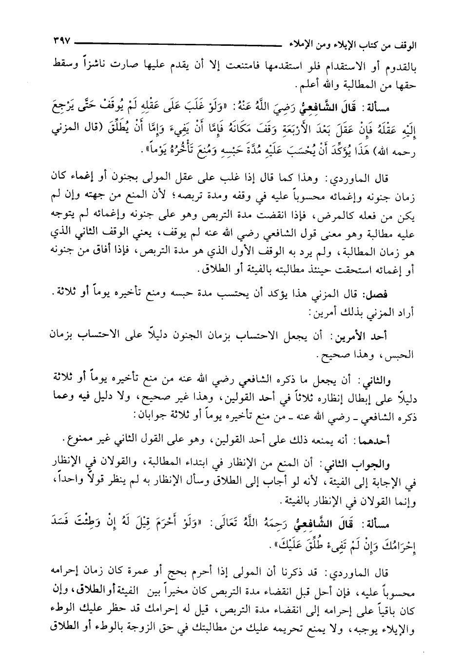 قال الشافعي رضي الله عنه: (وَلَوْ غُلِبَ عَلَى عَقْلِهِ لَمْ يُوقَفْ حَتَّى يَرْجِعَ إِلَيْهِ عَقْلُهُ فَإِنْ عَقِلَ بَعْدَ الْأَرْبَعَةِ وقف مكانه فَإِمَّا أَنْ يَفِيءَ وَإِمَّا أَنْ يُطَلِّقَ (قَالَ المزني رحمه الله) هذا يؤكد أن يحسب عليه مدة حبسه ومنع تأخره يوماً) .