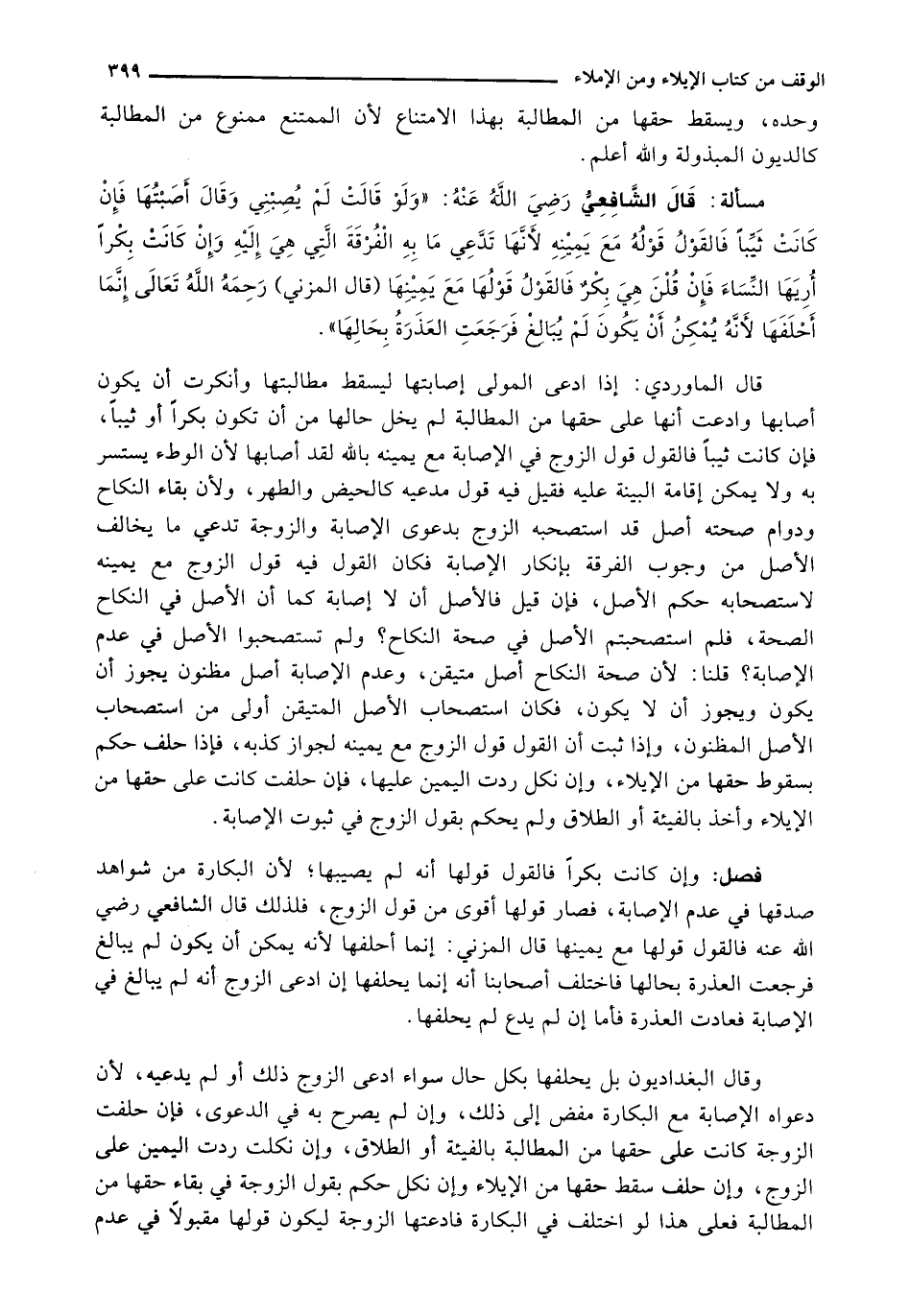 قَالَ الْمَاوَرْدِيُّ: إِذَا ادَّعَى الْمُولِي إِصَابَتَهَا لِيُسْقِطَ مُطَالَبَتَهَا وَأَنْكَرَتْ أَنْ يَكُونَ أَصَابَهَا وَادَّعَتْ أَنَّهَا عَلَى حَقِّهَا مِنَ الْمُطَالَبَةِ لَمْ يَخْلُ حَالُهَا مِنْ أَنْ تَكُونَ بِكْرًا أَوْ ثَيِّبًا، فَإِنْ كَانَتْ ثَيِّبًا فَالْقَوْلُ قَوْلُ الزَّوْجِ فِي الْإِصَابَةِ مَعَ يَمِينِهِ بِاللَّهِ لَقَدْ أَصَابَهَا لِأَنَّ الْوَطْءَ يستسر بِهِ وَلَا يُمْكِنُ إِقَامَةُ الْبَيِّنَةِ عَلَيْهِ فَقِيلَ فِيهِ قَوْلُ مُدَّعِيهِ كَالْحَيْضِ وَالطُّهْرِ، وَلِأَنَّ بَقَاءَ النِّكَاحِ وَدَوَامَ صِحَّتِهِ أَصِلٌ قَدِ اسْتَصْحَبَهُ الزَّوْجُ بِدَعْوَى الْإِصَابَةِ وَالزَّوْجَةُ تَدَّعِي مَا يُخَالِفُ الْأَصْلَ مِنْ وُجُوبِ الْفُرْقَةِ بِإِنْكَارِ الْإِصَابَةِ فَكَانَ الْقَوْلُ فِيهِ قَوْلَ الزَّوْجِ مَعَ يَمِينِهِ لِاسْتِصْحَابِهِ حُكْمَ الْأَصْلِ، فَإِنْ قِيلَ فَالْأَصْلُ أَنْ لَا إِصَابَةَ كَمَا أَنَّ الْأَصْلَ فِي النِّكَاحِ الصِّحَّةُ، فَلِمَ اسْتَصْحَبْتُمُ الْأَصْلَ فِي صِحَّةِ النِّكَاحِ؟ وَلَمْ تَسْتَصْحِبُوا الْأَصْلَ فِي عَدَمِ الْإِصَابَةِ؟ قُلْنَا: لِأَنَّ صِحَّةَ النِّكَاحِ أَصْلٌ مُتَيَقَّنٌ، وَعَدَمَ الْإِصَابَةِ أَصْلٌ مَظْنُونٌ يَجُوزُ أَنْ يَكُونَ وَيَجُوزُ أَنْ لَا يَكُونَ، فَكَانَ اسْتِصْحَابُ الْأَصْلِ الْمُتَيَقَّنِ أَوْلَى مِنَ اسْتِصْحَابِ الْأَصْلِ الْمَظْنُونِ، وَإِذَا ثَبَتَ أَنَّ الْقَوْلَ قَوْلُ الزَّوْجِ مَعَ يَمِينِهِ لِجَوَازِ كَذِبِهِ، فَإِذَا حَلَفَ حُكِمَ بِسُقُوطِ حَقِّهَا مِنَ الْإِيلَاءِ، وَإِنْ نَكَلَ رُدَّتِ الْيَمِينِ عَلَيْهَا، فَإِنْ حَلَفَتْ كَانَتْ عَلَى حَقِّهَا مِنَ الْإِيلَاءِ وَأُخِذَ بِالْفَيْئَةِ أَوِ الطَّلَاقِ وَلَمْ يُحْكَمْ بِقَوْلِ الزَّوْجِ فِي ثُبُوتِ الْإِصَابَةِ.