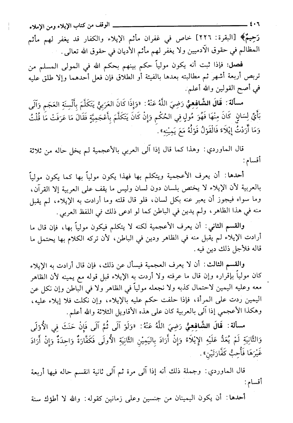 قَالَ الْمَاوَرْدِيُّ: وَهَذَا كَمَا قَالَ إِذَا آلَى الْعَرَبِيُّ بِالْأَعْجَمِيَّةِ لَمْ يَخْلُ حَالُهُ مِنْ ثَلَاثَةِ أَقْسَامٍ: