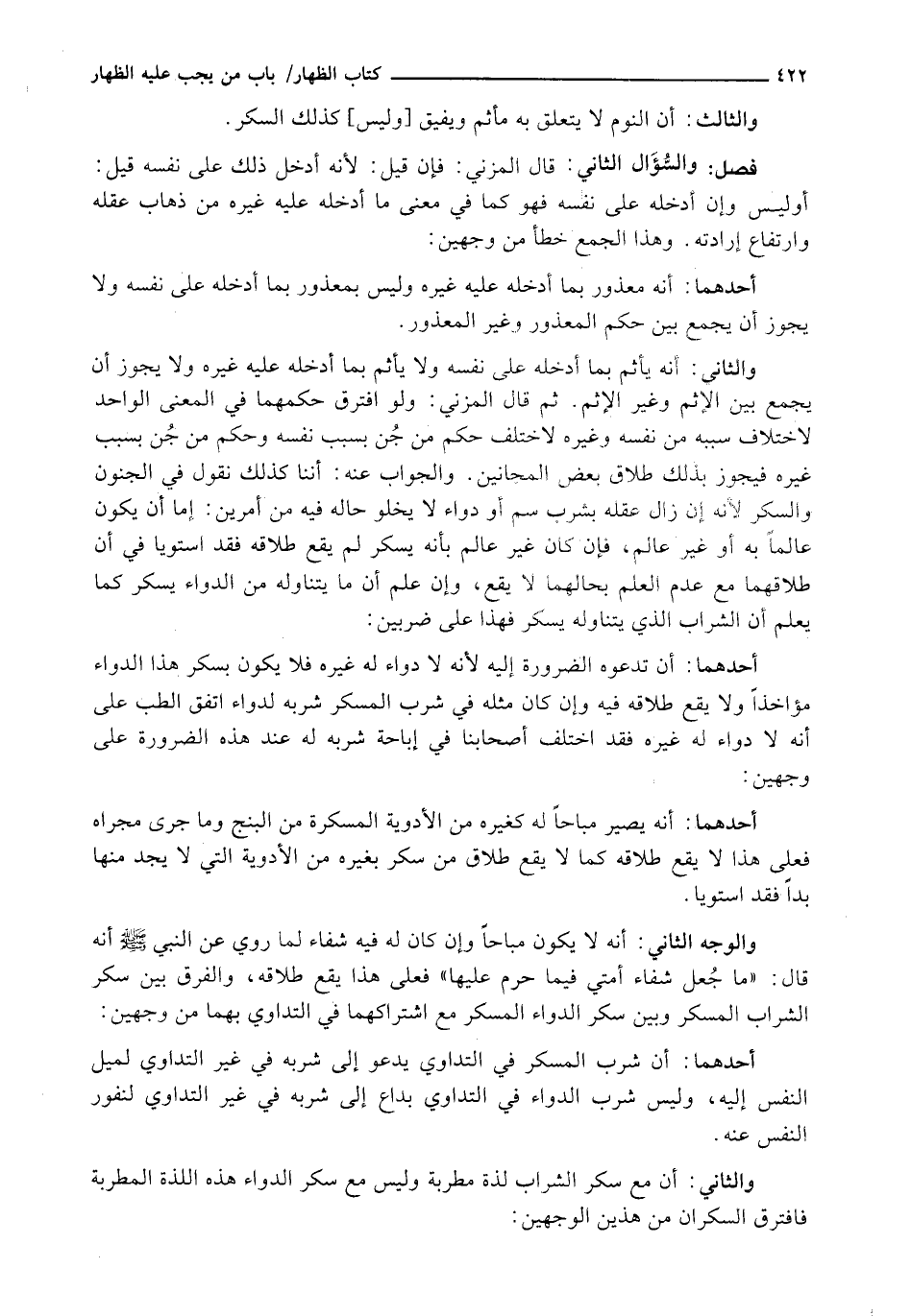 وَالثَّانِي: أَنَّهُ يَأْثَمُ بِمَا أَدْخَلَهُ عَلَى نَفْسِهِ وَلَا يَأْثَمُ بِمَا أَدْخَلَهُ عَلَيْهِ غَيْرُهُ وَلَا يَجُوزُ أَنْ يَجْمَعَ بَيْنَ الْإِثْمِ وَغَيْرِ الْإِثْمِ. ثُمَّ قَالَ الْمُزَنِيُّ: وَلَوِ افْتَرَقَ حُكْمُهُمَا فِي الْمَعْنَى الْوَاحِدِ لِاخْتِلَافِ سَبَبِهِ مِنْ نَفْسِهِ وَغَيْرِهِ لَاخْتَلَفَ حُكْمُ مَنْ جُنَّ بِسَبَبِ نَفْسِهِ وَحُكْمُ مَنْ جُنَّ بِسَبَبِ غَيْرِهِ فَيَجُوزُ بِذَلِكَ طَلَاقُ بَعْضِ الْمَجَانِينِ. وَالْجَوَابُ عَنْهُ: أَنَّنَا كَذَلِكَ نَقُولُ فِي الْجُنُونِ وَالسُّكْرِ لِأَنَّهُ إِنْ زَالَ عَقْلُهُ بِشُرْبِ سُمٍّ أَوْ دَوَاءٍ لَا يَخْلُو حَالُهُ فِيهِ مِنْ أَمْرَيْنِ: إِمَّا أَنْ يَكُونَ عَالِمًا بِهِ أَوْ غَيْرَ عَالِمٍ، فَإِنْ كَانَ غَيْرَ عَالِمٍ بِأَنَّهُ يُسْكِرُ لَمْ يَقَعْ طَلَاقُهُ فَقَدِ اسْتَوَيَا فِي أَنَّ طَلَاقَهُمَا مَعَ عَدَمِ الْعِلْمِ بِحَالِهِمَا لَا يَقَعُ، وَإِنْ عَلِمَ أَنَّ مَا يَتَنَاوَلُهُ مِنَ الدَّوَاءِ يُسْكِرُ كَمَا يَعْلَمُ أَنَّ الشَّرَابَ الَّذِي يَتَنَاوَلُهُ يُسْكِرُ فَهَذَا عَلَى ضَرْبَيْنِ:
