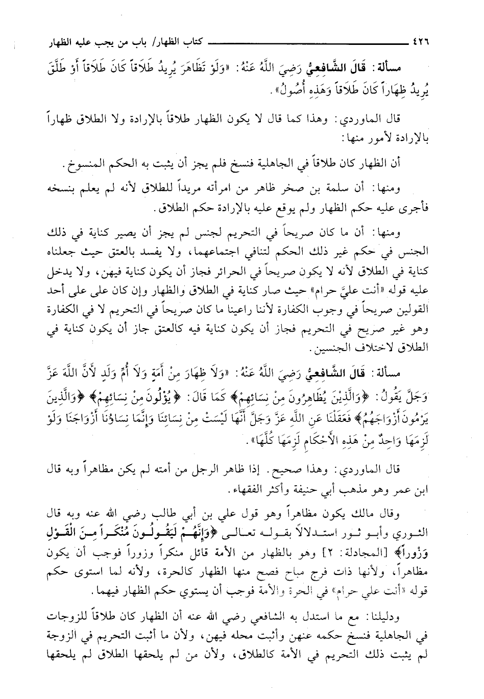 قال الشافعي رضي الله عنه: (وَلَا ظِهَارَ مِنْ أَمَةٍ وَلَا أُمِّ وَلَدٍ لِأَنَّ اللَّهَ عَزَّ وَجَلَّ يَقُولُ: {وَالَّذِينَ يُظَاهِرُونَ من نسائهم} كما قال: {يؤلون من نسائهم} {والذين يرمون أزواجهم} فَعَقَلْنَا عَنِ اللَّهِ عَزَّ وَجَلَّ أَنَّهَا لَيْسَتْ مِنْ نِسَائِنَا وَإِنَّمَا نِسَاؤُنَا أَزْوَاجُنَا وَلَوْ لَزِمَهَا وَاحِدٌ مِنْ هَذِهِ الْأَحْكَامِ لَزِمَهَا كَلُّهَا) .