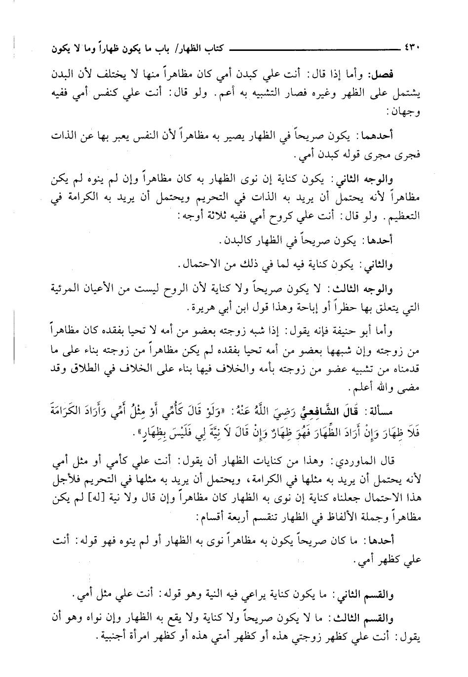 قَالَ الْمَاوَرْدِيُّ: وَهَذَا مِنْ كِنَايَاتِ الظِّهَارِ أَنْ يَقُولَ: أَنْتِ عَلَيَّ كَأُمِّي أَوْ مِثْلَ أُمِّي لِأَنَّهُ يَحْتَمِلُ أَنْ يُرِيدَ بِهِ مِثْلَهَا فِي الْكَرَامَةِ، وَيَحْتَمِلُ أَنْ يُرِيدَ بِهِ مِثْلَهَا فِي التَّحْرِيمِ فَلِأَجْلِ هَذَا الِاحْتِمَالِ جَعَلْنَاهُ كِنَايَةً إِنْ نَوَى بِهِ الظِّهَارَ كَانَ مُظَاهِرًا وَإِنْ قَالَ وَلَا نِيَّةَ [لَهُ] لَمْ يَكُنْ مُظَاهِرًا وَجُمْلَةُ الْأَلْفَاظِ فِي الظِّهَارِ تَنْقَسِمُ أَرْبَعَةَ أَقْسَامٍ: