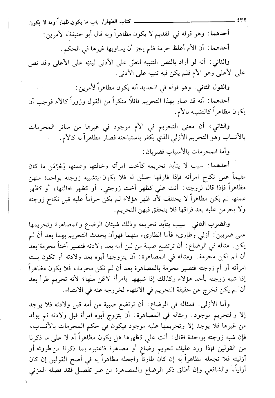 وَالضَّرْبُ الثَّانِي: سَبَبٌ يَتَأَبَّدُ تَحْرِيمُهُ وَذَلِكَ شيئان الرضاع والمصاهرة وتحريمها عَلَى ضَرْبَيْنِ: أَزَلِيٌّ وَطَارِئٌ فَأَمَّا الطَّارِئُ مِنْهُمَا فَهُوَ أَنْ يَحْدُثَ التَّحْرِيمُ بِهِمَا بَعْدَ أَنْ لَمْ يَكُنْ. مِثَالُهُ فِي الرَّضَاعِ: أَنْ تَرْتَضِعَ صَبِيَّةٌ مِنْ لَبَنِ أُمِّهِ بَعْدَ وِلَادَتِهِ فَتَصِيرُ أُخْتًا مُحَرَّمَةً بَعْدَ أَنْ لَمْ تَكُنْ مُحَرَّمَةً. وَمِثَالُهُ فِي الْمُصَاهَرَةِ: أَنْ يَتَزَوَّجَهَا أَبُوهُ بَعْدَ وِلَادَتِهِ أَوْ تَكُونَ بِنْتَ امْرَأَتِهِ أَوْ أُمَّ زَوْجَتِهِ فَتَصِيرُ مُحَرَّمَةً بِالْمُصَاهَرَةِ بَعْدَ أَنْ لَمْ تَكُنْ مُحَرَّمَةً، فَلَا يَكُونُ مُظَاهِرًا إِذَا شَبَّهَ زَوْجَتَهُ بِأَحَدِ هَؤُلَاءِ وَكَذَلِكَ إِذَا شَبَّهَهَا بِامْرَأَةٍ لا لَاعَنَ مِنْهَا؟ لِأَنَّهُ تَحْرِيمٌ طَرَأَ بَعْدَ أَنْ لَمْ يَكُنْ فَخَرَجَ عَنْ حَقِيقَةِ التَّحْرِيمِ فِي الِانْتِهَاءِ لِخُرُوجِهِ عَنْهُ فِي الِابْتِدَاءِ.