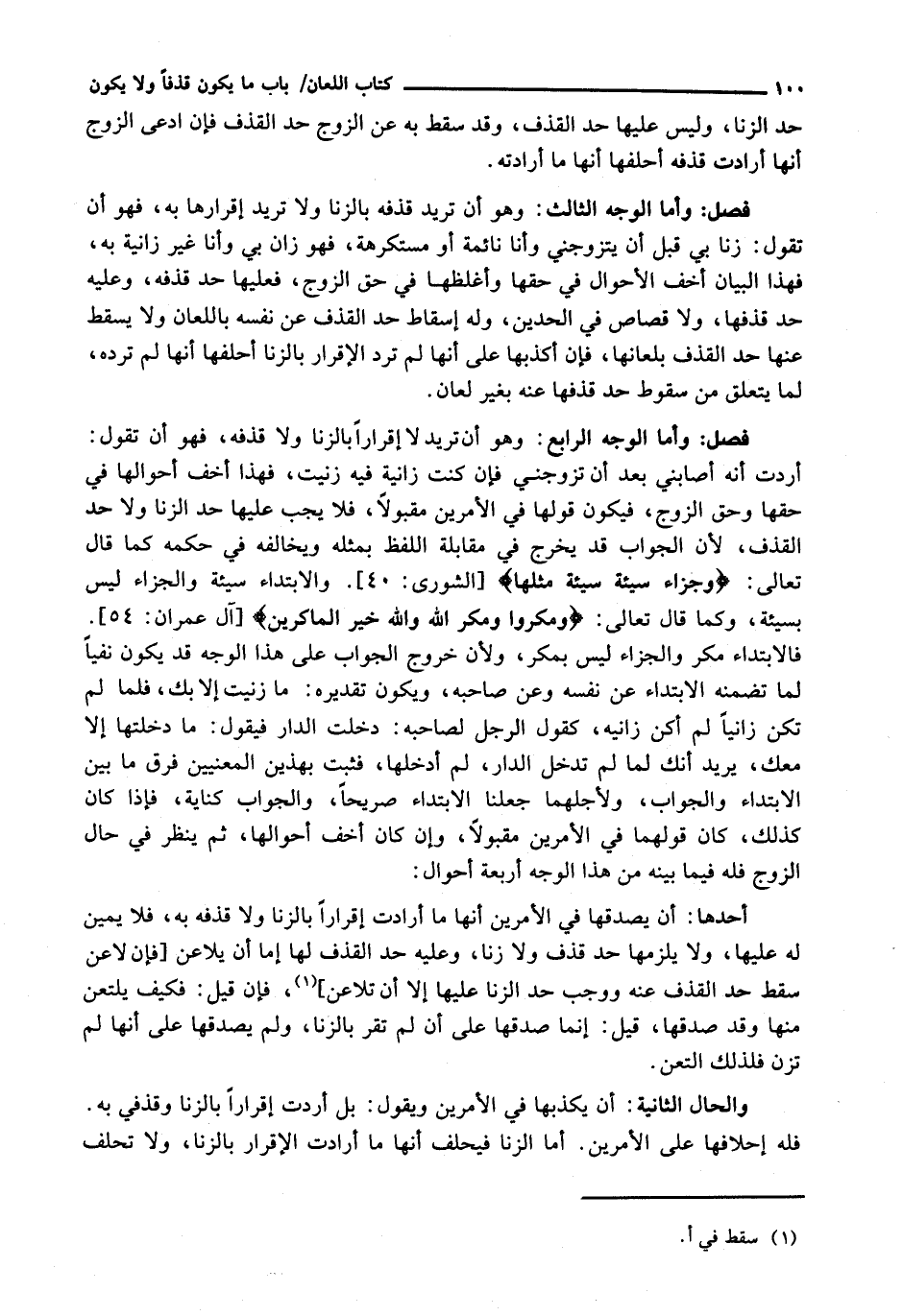 وَأَمَّا الْوَجْهُ الرَّابِعُ: وَهُوَ أَنْ تُرِيدَ لَا إِقْرَارًا بِالزِّنَا وَلَا قَذْفَهُ، فَهُوَ أَنْ تَقُولَ: أَرَدْتُ أَنَّهُ أَصَابَنِي بَعْدَ أَنْ تَزَوَّجَنِي فَإِنْ كُنْتُ زَانِيَةً فِيهِ زَنَيْتُ، فَهَذَا أَخَفُّ أَحْوَالِهَا فِي حقها وحق الزوج، فيكون قولها من الْأَمْرَيْنِ مَقْبُولًا، فَلَا يَجِبُ عَلَيْهَا حَدُّ الزِّنَا وَلَا حَدُّ الْقَذْفِ، لِأَنَّ الْجَوَابَ قَدْ يَخْرُجُ فِي مُقَابَلَةِ اللَّفْظِ بِمِثْلِهِ وَيُخَالِفُهُ فِي حُكْمِهِ كَمَا قَالَ تَعَالَى: {وَجَزَاءُ سَيِّئَةٍ سَيِّئَةٌ مِثْلُهَا} [الشورى: 40] . وَالِابْتِدَاءُ سَيِّئَةٌ وَالْجَزَاءُ لَيْسَ بِسَيِّئَةٍ، وَكَمَا قَالَ تَعَالَى: {وَمَكَرُوا وَمَكَرَ اللَّهُ وَاللَّهُ خَيْرُ الْمَاكِرِينَ} [آل عمران: 54] . فَالِابْتِدَاءُ مَكْرٌ وَالْجَزَاءُ لَيْسَ بِمَكْرٍ، وَلِأَنَّ خُرُوجَ الْجَوَابِ عَلَى هَذَا الْوَجْهِ قَدْ يَكُونُ نَفْيًا لِمَا تَضَمَّنَهُ الِابْتِدَاءُ عَنْ نَفْسِهِ وَعَنْ صَاحِبِهِ، وَيَكُونُ تَقْدِيرُهُ: مَا زَنَيْتُ إِلَّا بِكَ، فَلَمَّا لَمْ تَكُنْ زَانِيًا لَمْ أَكُنْ زَانِيَةً، كَقَوْلِ الرَّجُلِ لِصَاحِبِهِ: دَخَلْتَ الدَّارَ فَيَقُولُ: مَا دَخَلْتُهَا إِلَّا مَعَكَ: يُرِيدُ أَنَّكَ لَمَّا لَمْ تَدْخُلِ الدَّارَ، لَمْ أَدْخُلْهَا، فَثَبَتَ بِهَذَيْنِ الْمَعْنَيَيْنِ فَرْقُ مَا بَيْنَ الِابْتِدَاءِ وَالْجَوَابِ، وَلِأَجْلِهِمَا جَعَلْنَا الِابْتِدَاءَ صَرِيحًا، وَالْجَوَابَ كِنَايَةً، فَإِذَا كَانَ كَذَلِكَ، كَانَ قَوْلُهُمَا فِي الْأَمْرَيْنِ مَقْبُولًا، وَإِنْ كَانَ أَخَفَّ أَحْوَالِهَا، ثُمَّ يَنْظُرُ فِي حَالِ الزَّوْجِ فَلَهُ فِيمَا بَيْنَهُ مِنْ هَذَا الوجه أربعة أحوال: