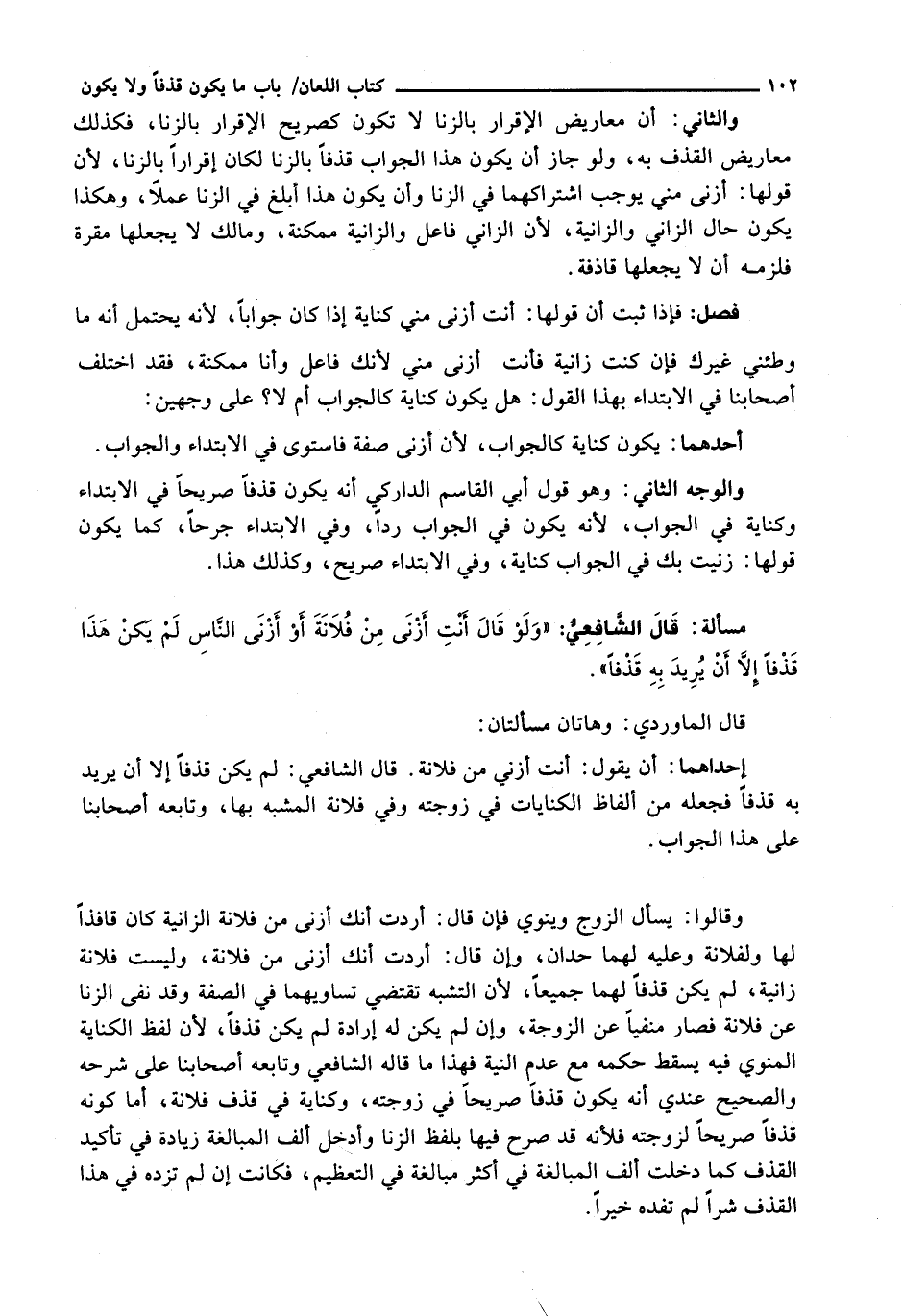 وَقَالُوا: يُسْأَلُ الزَّوْجُ وَيَنْوِي فَإِنْ قَالَ: أَرَدْتُ أَنَّكِ أَزْنَى من فلانة الزانية كان قافذاً لَهَا وَلِفُلَانَةَ وَعَلَيْهِ لَهُمَا حَدَّانِ، وَإِنْ قَالَ: أَرَدْتُ أَنَّكِ أَزْنَى مِنْ فُلَانَةَ، وَلَيْسَتْ فُلَانَةُ زَانِيَةً، لَمْ يَكُنْ قَذْفًا لَهُمَا جَمِيعًا، لِأَنَّ التَّشَبُّهَ تَقْتَضِي تَسَاوِيَهُمَا فِي الصِّفَةِ وَقَدْ نَفَى الزِّنَا عَنْ فُلَانَةَ فَصَارَ مَنْفِيًّا عَنِ الزَّوْجَةِ، وَإِنْ لَمْ يَكُنْ لَهُ إِرَادَةٌ لَمْ يَكُنْ قَذْفًا، لِأَنَّ لَفْظَ الْكِنَايَةِ الْمَنَوِيَّ فِيهِ يَسْقُطُ حُكْمُهُ مَعَ عَدَمِ النِّيَّةِ فَهَذَا مَا قَالَهُ الشَّافِعِيُّ وَتَابَعَهُ أَصْحَابُنَا عَلَى شَرْحِهِ وَالصَّحِيحُ عِنْدِي أَنَّهُ يَكُونُ قَذْفًا صَرِيحًا فِي زَوْجَتِهِ، وَكِنَايَةً فِي قَذْفِ فُلَانَةَ، أَمَّا كَوْنُهُ قَذْفًا صَرِيحًا لِزَوْجَتِهِ فلانة قَدْ صَرَّحَ فِيهَا بِلَفْظِ الزِّنَا وَأَدْخَلَ أَلِفَ الْمُبَالَغَةِ زِيَادَةً فِي تَأْكِيدِ الْقَذْفِ كَمَا دَخَلَتْ أَلِفُ الْمُبَالَغَةِ فِي أَكْثَرِ مُبَالَغَةٍ فِي التَّعْظِيمِ، فَكَانَتْ إِنْ لَمْ تَزِدْهُ فِي هَذَا الْقَذْفِ شَرًّا لَمْ تُفِدْهُ خَيْرًا.