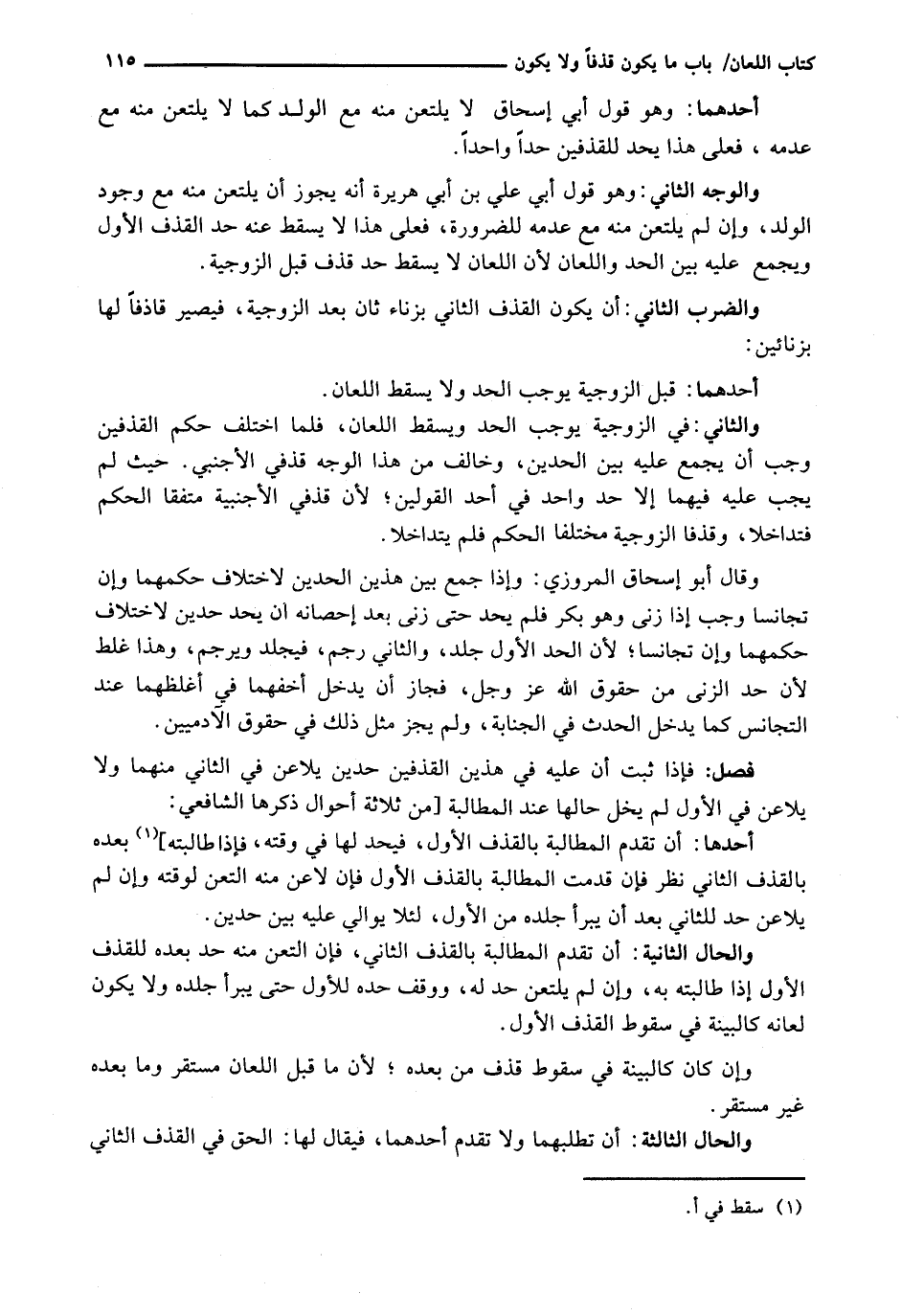 وَالْوَجْهُ الثَّانِي: وَهُوَ قَوْلُ أَبِي عَلِيِّ بْنِ أَبِي هُرَيْرَةَ أَنَّهُ يَجُوزُ أَنْ يَلْتَعِنَ مِنْهُ مَعَ وُجُودِ الْوَلَدِ، وَإِنْ لَمْ يَلْتَعِنَ مِنْهُ مَعَ عَدَمِهِ لِلضَّرُورَةِ، فَعَلَى هَذَا لَا يَسْقُطُ عَنْهُ حَدُّ الْقَذْفِ الْأَوَّلِ وَيُجْمَعُ عَلَيْهِ بَيْنَ الْحَدِّ وَاللِّعَانِ لِأَنَّ اللِّعَانَ لَا يُسْقِطُ حَدَّ قَذْفٍ قَبْلَ الزَّوْجِيَّةِ.