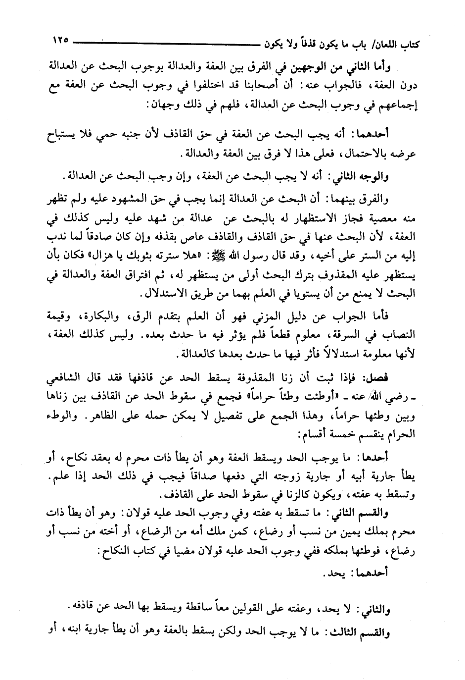 وَالْفَرْقُ بَيْنَهُمَا: أَنَّ الْبَحْثَ عَنِ الْعَدَالَةِ إِنَّمَا يَجِبُ فِي حَقِّ الْمَشْهُودِ عَلَيْهِ وَلَمْ تَظْهَرْ مِنْهُ مَعْصِيَةٌ فَجَازَ الِاسْتِظْهَارُ لَهُ بِالْبَحْثِ عَنْ عَدَالَةِ مَنْ شَهِدَ عَلَيْهِ وَلَيْسَ كَذَلِكَ فِي الْعِفَّةِ، لِأَنَّ الْبَحْثَ عَنْهَا فِي حَقِّ الْقَاذِفِ وَالْقَاذِفُ عَاصٍ بِقَذْفِهِ وَإِنْ كَانَ صَادِقًا لِمَا نُدِبَ إِلَيْهِ مِنَ السَّتْرِ عَلَى أَخِيهِ، وَقَدْ قَالَ رَسُولُ اللَّهِ - صَلَّى اللَّهُ عَلَيْهِ وَسَلَّم َ -: " هَلَّا سَتَرْتَهُ بِثَوْبِكَ يَا هَزَّالُ " فَكَانَ بِأَنْ يَسْتَظْهِرَ عَلَيْهِ الْمَقْذُوفُ بِتَرْكِ الْبَحْثِ أَوْلَى مِنْ يَسْتَظْهِرَ لَهُ، ثُمَّ افْتِرَاقُ الْعِفَّةِ وَالْعَدَالَةِ فِي الْبَحْثِ لَا يَمْنَعُ مِنْ أَنْ يَسْتَوِيَا فِي الْعِلْمِ بِهِمَا مِنْ طَرِيقِ الِاسْتِدْلَالِ.