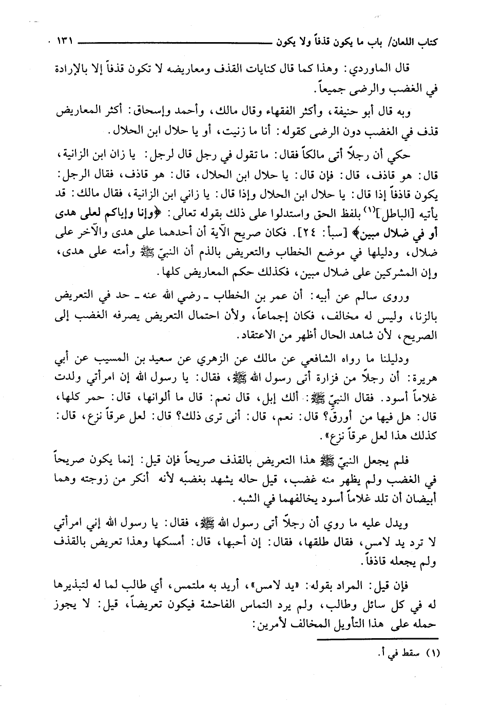 حُكِيَ أَنَّ رَجُلًا أَتَى مَالِكًا فَقَالَ: مَا تَقُولُ فِي رَجُلٍ قَالَ لِرَجُلٍ: يَا زَانِ ابْنَ الزَّانِيَةِ، قَالَ: هُوَ قَاذِفٌ، قَالَ: فَإِنْ قَالَ: يَا حَلَالُ ابْنَ الْحَلَالِ، قَالَ هُوَ قَاذِفٌ، فَقَالَ الرَّجُلُ: يَكُونُ قَاذِفًا إِذَا قَالَ: يَا حَلَالُ ابْنَ الْحَلَالِ وَإِذَا قَالَ: يَا زَانِي ابْنَ الزَّانِيَةِ، فَقَالَ مَالِكٌ: قَدْ يَأْتِيهِ [الْبَاطِلُ] بِلَفْظِ الْحَقِّ وَاسْتَدَلُّوا عَلَى ذَلِكَ بقوله تعالى: {وإنا وإياكم لَعَلَى هُدًى أَوْ فِي ضَلالٍ مُبِينٍ} [سبأ: 24] . فَكَانَ صَرِيحَ الْآيَةِ أَنَّ أَحَدَهُمَا عَلَى هُدًى وَالَآخَرَ عَلَى ضَلَالٍ، وَدَلِيلُهَا فِي مَوْضِعِ الْخِطَابِ وَالتَّعْرِيضِ بِالذَّمِّ أَنَّ النَّبِيَّ - صَلَّى اللَّهُ عَلَيْهِ وَسَلَّم َ - وَأُمَّتَهُ عَلَى هُدًى، وَأَنَّ الْمُشْرِكِينَ عَلَى ضَلَالٍ مُبِينٍ، فَكَذَلِكَ حُكْمُ الْمَعَارِيضِ كُلِّهَا.