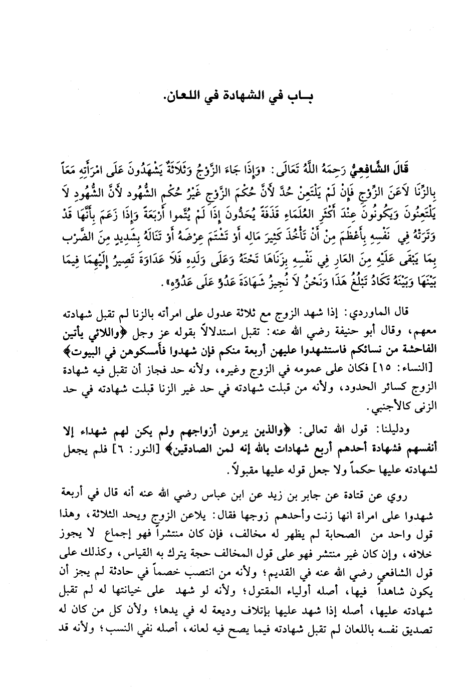 قَالَ الْمَاوَرْدِيُّ: إِذَا شَهِدَ الزَّوْجُ مَعَ ثَلَاثَةٍ عُدُولٍ عَلَى امْرَأَتِهِ بِالزِّنَا لَمْ تُقْبَلْ شَهَادَتُهُ مَعَهُمْ، وَقَالَ أَبُو حَنِيفَةَ رَضِيَ اللَّهُ عَنْهُ: تُقْبَلُ استدلالا بقوله عز وجل {واللائي يأتين الفاحشة من نسائكم فاسشهدوا عَلَيْهِنَّ أَرْبَعَةً مِنْكُمْ فَإِنْ شَهِدُوا فَأَمْسِكُوهُنَّ فِي الْبُيُوتِ} [النساء: 15] فَكَانَ عَلَى عُمُومِهِ فِي الزَّوْجِ وَغَيْرِهِ، وَلِأَنَّهُ حَدٌّ فَجَازَ أَنْ تُقْبَلَ فِيهِ شَهَادَةُ الزَّوْجِ كَسَائِرِ الْحُدُودِ، وَلِأَنَّهُ مَنْ قُبِلَتْ شَهَادَتُهُ فِي حَدٍّ غَيْرِ الزِّنَا قُبِلَتْ شَهَادَتُهُ فِي حَدِّ الزِّنَى كَالْأَجْنَبِيِّ.