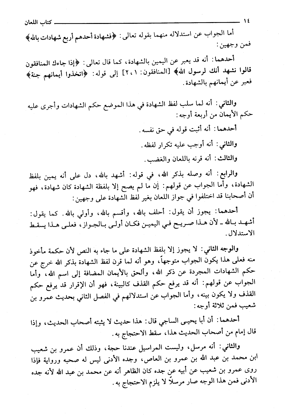 وَالْوَجْهُ الثَّانِي: لَا يَجُوزُ إِلَّا بِلَفْظِ الشَّهَادَةِ عَلَى مَا جَاءَ بِهِ النَّصُّ لِأَنَّ حُكْمَهُ مَأْخُوذٌ مِنْهُ فَعَلَى هَذَا يَكُونُ الْجَوَابُ مُتَوَجِّهًا، وَهُوَ أَنَّهُ لَمَّا قَرَنَ لَفْظَ الشَّهَادَةِ بِذِكْرِ اللَّهِ خَرَجَ عَنْ حُكْمِ الشَّهَادَاتِ الْمُجَرَّدَةِ عَنْ ذِكْرِ اللَّهِ، وَأُلْحِقَ بِالْأَيْمَانِ الْمُضَافَةِ إِلَى اسْمِ اللَّهِ، وَأَمَّا الْجَوَابُ عَنْ قَوْلِهِمْ: إِنَّهُ قَدْ يَرْفَعُ حُكْمَ الْقَذْفِ كَالْبَيِّنَةِ، فَهُوَ أَنَّ الْإِقْرَارَ قَدْ يَرْفَعُ حُكْمَ الْقَذْفِ وَلَا يَكُونُ بَيِّنَةً، وَأَمَّا الْجَوَابُ عَنِ اسْتِدْلَالِهِمْ فِي الْفَصْلِ الثَّانِي بِحَدِيثِ عَمْرِو بْنِ شُعَيْبٍ فَمِنْ ثَلَاثَةِ أَوْجُهٍ: