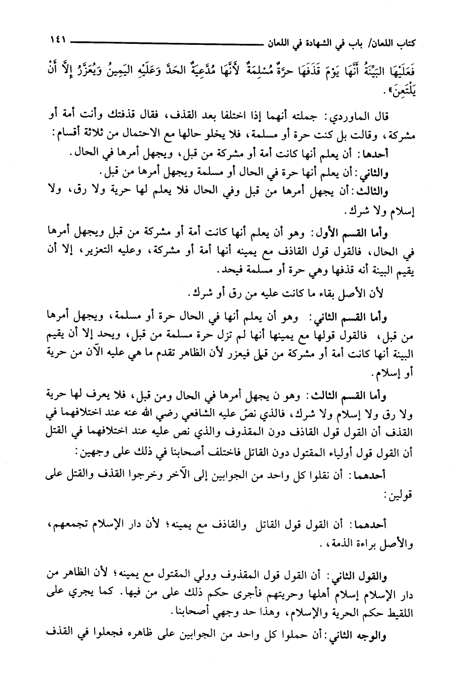قال الماوردي: جملته أَنَّهُمَا إِذَا اخْتَلَفَا بَعْدَ الْقَذْفِ، فَقَالَ قَذَفْتُكِ وَأَنْتِ أَمَةٌ أَوْ مُشْرِكَةٌ، وَقَالَتْ بَلْ كُنْتُ حُرَّةً أَوْ مُسْلِمَةً، فَلَا يَخْلُو حَالُهَا مَعَ الِاحْتِمَالِ مِنْ ثَلَاثَةِ أَقْسَامٍ:
